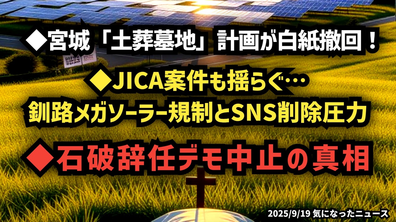 ◆宮城「土葬墓地」計画が白紙撤回!◆JICA案件も揺らぐ…釧路メガソーラー規制とSNS削除圧力◆石破辞任デモ中止の真相<br><br>あらすじ/予告編<br>宮城県で進められていたイスラム教徒向け「土葬墓地計画」が白紙撤回されました。背景には住民や県外からの強い反発があると見られます。一方、新潟県三条市ではJICAと関わる類似プロジェクトが情報公開延期となり、撤回の可能性も残されています。北海道釧路市では巨大メガソーラーを巡り新たな条例が可決、市民の賛否が分かれています。さらに、日本政府がXに「通報強化」を求めたとの報道や、石破茂氏の辞任要求デモ中止と東京での「自民党解体デモ」予定など、国内の注目トピックスをまとめました。<br><br>◆今回の台本(詳細)<a href="https://keiichiro8140.hatenablog.com/entry/25091999111" target="_blank" rel="noopener nofollow">https://keiichiro8140.hatenablog.com/entry/25091999111</a><br><br>◆YouTubeチャンネル登録よろしくお願いします🙏 <a href="https://www.youtube.com/@K16news888" target="_blank" rel="noopener nofollow">https://www.youtube.com/@K16news888</a><br><br>◆もしも(BAN)の時のためのマイリンク集<a href="https://lit.link/K16_888" target="_blank" rel="noopener nofollow">https://lit.link/K16_888</a><br><br>ご覧いただきありがとうございます<br>m(_ _)m<br>気になったニュース 2025/9/19<br><br />著作権、肖像権に配慮して作成しております。<br><br>◆気になったニュースの台本!?<br>メモ代わりに作った台本をそのままあげてます<br><a href="https://keiichiro8140.hatenablog.com/." target="_blank" rel="noopener nofollow">https://keiichiro8140.hatenablog.com/.</a><br><br><br>ここからはシリーズ紹介<br><br><br>◆ ワクチン解毒・デトックス<br><a href="https://x.gd/fZweg" target="_blank" rel="noopener nofollow">https://x.gd/fZweg</a><br><br>◆ウイリアム・マキス博士のがん治療(イベルメクチン・フェンベンダゾール等)<br><a href="https://x.gd/AtFYS" target="_blank" rel="noopener nofollow">https://x.gd/AtFYS</a><br><br>◆予防接種健康被害救済制度<br><a href="https://x.gd/0xK9x" target="_blank" rel="noopener nofollow">https://x.gd/0xK9x</a><br><br>◆気になったニュース #1501~<br><br>◆ 【ショートver】気になったニュース<br><a href="https://x.gd/7MxXC" target="_blank" rel="noopener nofollow">https://x.gd/7MxXC</a><br><br>◆ 気になったニュース #1001~<br><a href="https://x.gd/Lp8gv" target="_blank" rel="noopener nofollow">https://x.gd/Lp8gv</a><br><br>◆ 気になったニュース #501~<br><a href="https://x.gd/EmbS4" target="_blank" rel="noopener nofollow">https://x.gd/EmbS4</a><br><br>◆ 気になったニュース #1~#500<br><a href="https://x.gd/uPhNb" target="_blank" rel="noopener nofollow">https://x.gd/uPhNb</a><br><br>◆ X(旧Twitter)・テレグラムで気になった情報<br><a href="https://x.gd/YG6FT" target="_blank" rel="noopener nofollow">https://x.gd/YG6FT</a><br><br>◆ 日比谷5万人パレードデ⚪生放送アーカイブ動画<br><a href="https://x.gd/3CHJv" target="_blank" rel="noopener nofollow">https://x.gd/3CHJv</a><br><br>◆日比谷5万人パレード⚪モのマイリスト作ってみました<br><a href="https://nico.ms/mylist/76828848?ref=sp_other" target="_blank" rel="noopener nofollow">https://nico.ms/mylist/76828848?ref=sp_other</a><br><br>◆3.30 令和の百姓⚪⚪<br><a href="https://www.nicovideo.jp/series/511791?ref=garage_share_other" target="_blank" rel="noopener nofollow">https://www.nicovideo.jp/series/511791?ref=garage_share_other</a><br><br>◆ 及川幸久さんの【XNEWS】シリーズ<br><a href="https://x.gd/3k78K" target="_blank" rel="noopener nofollow">https://x.gd/3k78K</a><br><br>◆これまでの動画<a href="https://x.gd/sPXoJ" target="_blank" rel="noopener nofollow">https://x.gd/sPXoJ</a><br><br>◆もしも(BAN)の時のためのマイリンク集<a href="https://lit.link/K-16_News44" target="_blank" rel="noopener nofollow">https://lit.link/K-16_News44</a><br><br>