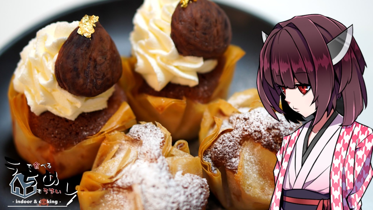 <strong>第五回 栗のパートフィロ編</strong><br><br>-渋皮栗の甘露煮-<br>・栗300g<br>・重曹小さじ1<br>・グラニュー糖100g<br>・きび砂糖80g<br><br>-クレームダマンド-<br>・バター100g<br>・粉砂糖100g<br>・全卵100g<br>・アーモンドプードル100g<br>・ラム酒10g<br><br>-パートフィロ-<br>・パートフィロ3枚<br>・溶かしバター20g<br><br>-焼き時間-<br>200℃/予熱<br>190℃/40分<br><br>-仕上げ-<br>・生クリーム50g<br>・グラニュー糖4g<br>・解けない粉糖適量<br>・金箔適量<br><br>そとめしマイリス <a href="https://www.nicovideo.jp/mylist/68086560" target="_blank" rel="noopener">mylist/68086560</a><br>≪Twitter≫ <a href="https://x.com/sorachi_cafei" target="_blank" rel="noopener nofollow">https://x.com/sorachi_cafei</a><br><br>
