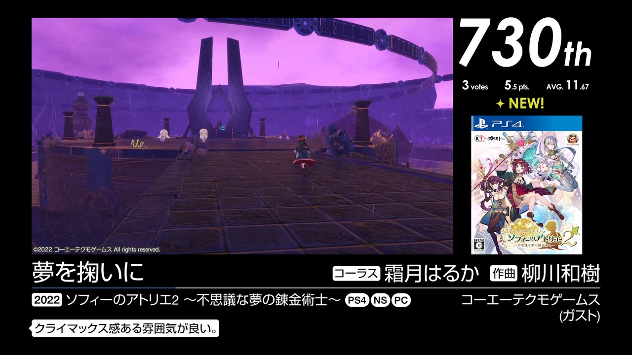 748位~725位の27曲を収録。<br><br>2024年6月11日~2024年8月1日で行われた「第17回みんなで決めるゲーム音楽ベスト100」の投票結果動画です。集計人≠動画制作者<br>11巡目にツモるんじゃないですか<br><br><a href="https://www.nicovideo.jp/watch/sm45397653" class="watch">sm45397653</a>←前 次→<a href="https://www.nicovideo.jp/watch/sm45449273" class="watch">sm45449273</a><br><a href="https://www.nicovideo.jp/mylist/78315745" target="_blank" rel="noopener">mylist/78315745</a> <a href="https://www.nicovideo.jp/series/523562" target="_blank" rel="noopener">series/523562</a><br><br>748位 <a href="#" class="seekTime" data-seekTime="0:40" onclick="seekNicoPlayer('#0:40'); return false;">#0:40</a>, <a href="#" class="seekTime" data-seekTime="4:17" onclick="seekNicoPlayer('#4:17'); return false;">#4:17</a>, <a href="#" class="seekTime" data-seekTime="10:38" onclick="seekNicoPlayer('#10:38'); return false;">#10:38</a>, <a href="#" class="seekTime" data-seekTime="14:26" onclick="seekNicoPlayer('#14:26'); return false;">#14:26</a> / 743位 <a href="#" class="seekTime" data-seekTime="17:14" onclick="seekNicoPlayer('#17:14'); return false;">#17:14</a>, <a href="#" class="seekTime" data-seekTime="22:08" onclick="seekNicoPlayer('#22:08'); return false;">#22:08</a>, <a href="#" class="seekTime" data-seekTime="27:11" onclick="seekNicoPlayer('#27:11'); return false;">#27:11</a>, <a href="#" class="seekTime" data-seekTime="29:05" onclick="seekNicoPlayer('#29:05'); return false;">#29:05</a>, <a href="#" class="seekTime" data-seekTime="31:33" onclick="seekNicoPlayer('#31:33'); return false;">#31:33</a> / 741位 <a href="#" class="seekTime" data-seekTime="33:20" onclick="seekNicoPlayer('#33:20'); return false;">#33:20</a>, <a href="#" class="seekTime" data-seekTime="34:51" onclick="seekNicoPlayer('#34:51'); return false;">#34:51</a> / 738位 <a href="#" class="seekTime" data-seekTime="37:27" onclick="seekNicoPlayer('#37:27'); return false;">#37:27</a>, <a href="#" class="seekTime" data-seekTime="40:12" onclick="seekNicoPlayer('#40:12'); return false;">#40:12</a>, <a href="#" class="seekTime" data-seekTime="43:12" onclick="seekNicoPlayer('#43:12'); return false;">#43:12</a> / 737位 <a href="#" class="seekTime" data-seekTime="46:20" onclick="seekNicoPlayer('#46:20'); return false;">#46:20</a> / 734位 <a href="#" class="seekTime" data-seekTime="53:53" onclick="seekNicoPlayer('#53:53'); return false;">#53:53</a>, <a href="#" class="seekTime" data-seekTime="57:10" onclick="seekNicoPlayer('#57:10'); return false;">#57:10</a>, <a href="#" class="seekTime" data-seekTime="62:05" onclick="seekNicoPlayer('#62:05'); return false;">#62:05</a> / 732位 <a href="#" class="seekTime" data-seekTime="65:24" onclick="seekNicoPlayer('#65:24'); return false;">#65:24</a>, <a href="#" class="seekTime" data-seekTime="69:03" onclick="seekNicoPlayer('#69:03'); return false;">#69:03</a> / 730位 <a href="#" class="seekTime" data-seekTime="72:26" onclick="seekNicoPlayer('#72:26'); return false;">#72:26</a>, <a href="#" class="seekTime" data-seekTime="75:21" onclick="seekNicoPlayer('#75:21'); return false;">#75:21</a> / 726位 <a href="#" class="seekTime" data-seekTime="79:05" onclick="seekNicoPlayer('#79:05'); return false;">#79:05</a>, <a href="#" class="seekTime" data-seekTime="84:30" onclick="seekNicoPlayer('#84:30'); return false;">#84:30</a>, <a href="#" class="seekTime" data-seekTime="88:20" onclick="seekNicoPlayer('#88:20'); return false;">#88:20</a>, <a href="#" class="seekTime" data-seekTime="93:44" onclick="seekNicoPlayer('#93:44'); return false;">#93:44</a> / 725位 <a href="#" class="seekTime" data-seekTime="96:20" onclick="seekNicoPlayer('#96:20'); return false;">#96:20</a><br><br>----------<br><br>スクリーンショット募集中!詳細はこちら↓<br><a href="https://gamemusic17.vercel.app/" target="_blank" rel="noopener nofollow">https://gamemusic17.vercel.app/</a><br><br>結果詳細↓<br><a href="https://w.atwiki.jp/gamemusicbest100/pages/10538.html" target="_blank" rel="noopener nofollow">https://w.atwiki.jp/gamemusicbest100/pages/10538.html</a><br /><br>----------<br><br>第2回みんなで決める和風曲ランキング 2/28まで投票受付中!<br><a href="https://jbbs.shitaraba.net/bbs/read.cgi/music/25545/1764514793/" target="_blank" rel="noopener nofollow">https://jbbs.shitaraba.net/bbs/read.cgi/music/25545/1764514793/</a><br><br>みんなで決める2025年の新曲ゲーム音楽ランキング 3/31まで投票受付中!<br><a href="https://jbbs.shitaraba.net/bbs/read.cgi/music/25545/1769870472/" target="_blank" rel="noopener nofollow">https://jbbs.shitaraba.net/bbs/read.cgi/music/25545/1769870472/</a>