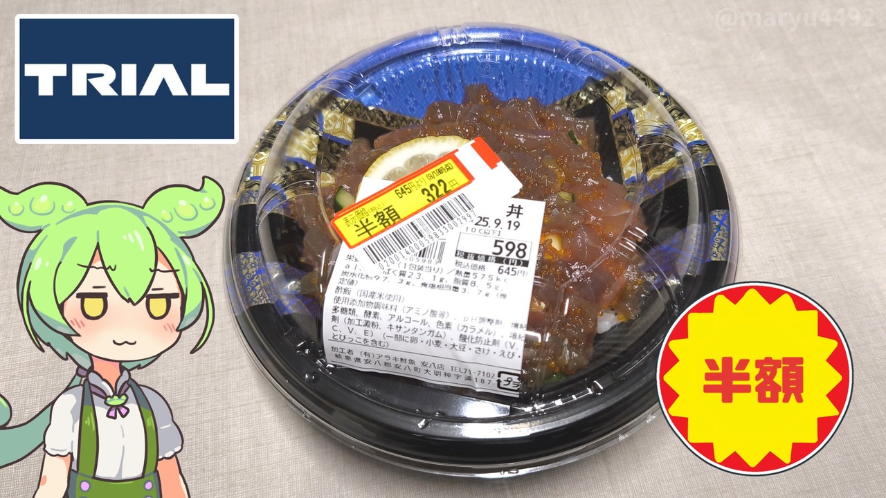 今回紹介するトライアルの海鮮丼は<br>年間150万食を突破する人気商品らしいです(※トライアル談)<br><br><br>【前回のトライアル動画】<br>夜のトライアルで買った「値引きされたお惣菜3点」<br><a href="https://www.nicovideo.jp/watch/sm45118851" target="_blank" rel="noopener nofollow">https://www.nicovideo.jp/watch/sm45118851</a><br><br>【参考】<br>年間150万食突破!鮮度抜群、旨みたっぷりの「魚屋の海鮮漬け丼」2025.05.30(トライアル)<br><a href="https://www.trial-net.co.jp/mag/detail/21706/" target="_blank" rel="noopener nofollow">https://www.trial-net.co.jp/mag/detail/21706/</a><br><br>【使用した素材】(※敬称略) <br>(合成音声)VOICEVOX/ずんだもん/四国めたん<br><a href="https://voicevox.hiroshiba.jp/" target="_blank" rel="noopener nofollow">https://voicevox.hiroshiba.jp/</a> <br>(立ち絵)坂本アヒル<br> <a href="https://seiga.nicovideo.jp/seiga/im10788496?track" target="_blank" rel="noopener nofollow">https://seiga.nicovideo.jp/seiga/im10788496?track</a><br>(楽曲)甘茶の音楽工房/「楽しい麦畑」「お城の舞踏会」<br><a href="https://amachamusic.chagasi.com/" target="_blank" rel="noopener nofollow">https://amachamusic.chagasi.com/</a>