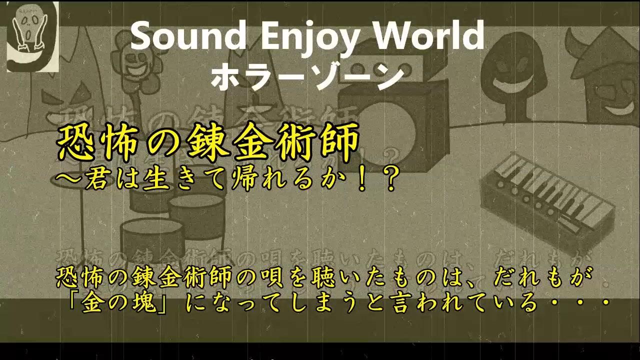 おひさしぶりです、あくなあないん(Akner9)と申します<br>Sound Enjoy World ホラーゾーンの参加作品です<br><br>SEWの全作品こちらから↓<br><a href="http://sewpj.pages.dev/songs" target="_blank" rel="noopener nofollow">http://sewpj.pages.dev/songs</a><br><br>作者のX↓<br><a href="https://x.com/Akner91" target="_blank" rel="noopener nofollow">https://x.com/Akner91</a><br><br><br>その唄と演奏を聴いたものはすべて金になってしまうと言われている、、、<br><br>恐怖の錬金術師<br>君は生きて帰れるのか!?<br><br>トニカクコワイ<br>恐怖の演奏をお楽しみください・・・<br><br>Title:恐怖の錬金術師<br>(詞/曲):恐怖の錬金術師と恐怖の楽団<br><br>Vo:恐怖の錬金術師(Natalie Synthesizer V)<br>Ba:恐怖の四弦師(A9)<br>Key:恐怖の鍵盤師(A9)<br>Dr:恐怖の太鼓師(打込、BFD2)<br><br>BPM128:ホラー、サイケ、ファンク<br><br>歌詞:<br>no one knows my name in this glorious world<br>この輝かしい世界で、私の名前を知っている人はいないよ<br><br>cause everyone who sees me turns to gold<br>なぜなら、私を見たものは、みな金塊になってしまうからね<br><br>It's your misfortune to meet me on the darkest road.<br>この暗い道で私に出会うとは、運のつきだね<br><br>The black crow is croaking something from its throat.<br>黒いカラスも、のどを鳴らしているよ<br><br>(呪いの呪文:閲覧注意!)<br><br>How strong you are!? so the spell just broke<br>あなたはなんて強いの!?魔法がかからないなんて<br><br>The candle laughed at me with a curling smoke.<br>ろうそくが渦巻く煙を吹きながら私を笑ってる、、、<br><br>You avoided my charm, escaped my buautiful game,<br>あなたは私の魅力かわして、美しいゲームから逃げたのね<br><br>But next time, darling, you won’t leave the same.<br>でも、ダーリン、次はそうはいかないよ!<br><br>(呪いの呪文:閲覧注意!)<br><br>(さらに強力な呪いの呪文:閲覧注意!!)<br><br><br><br><br>