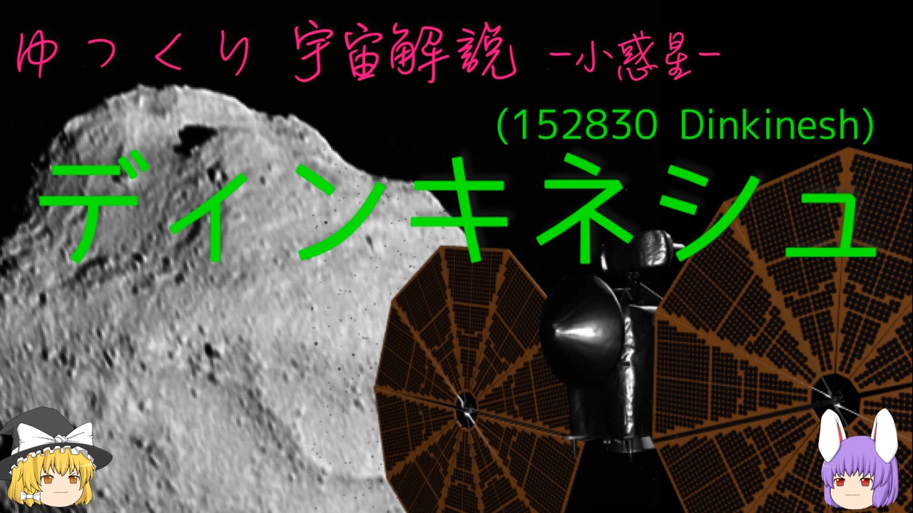 今回は小惑星【152830 ディンキネシュ】です。<br><br>動画中、一部文字が小さい箇所がありますので、<br>できるだけ大きな画面でご覧いただくことを推奨します。<br>補助資料として、静画や関連動画もご用意しました。<br><br>◆小惑星分類に関して <br>ゆっくり宇宙解説【小惑星】 <br><a href="https://www.nicovideo.jp/watch/sm44559066" target="_blank" rel="noopener nofollow">https://www.nicovideo.jp/watch/sm44559066</a> <br><br>◆JPLデータに基づく Lucy と Dinkinesh の軌道アニメーション <br><a href="https://seiga.nicovideo.jp/seiga/im11673862" target="_blank" rel="noopener nofollow">https://seiga.nicovideo.jp/seiga/im11673862</a> <br>視点変更・速度調整・日付スライダーなど、いろいろと “弄れる” 仕様です。 <br>ぜひお試し下さい。 <br><br>---<br><br>他の動画はシリーズからご覧いただけます。 <br>・単発 <a href="https://www.nicovideo.jp/series/66727" target="_blank" rel="noopener">series/66727</a> <br>・太陽系 <a href="https://www.nicovideo.jp/series/66725" target="_blank" rel="noopener">series/66725</a> <br>・窮理学 <a href="https://www.nicovideo.jp/series/353339" target="_blank" rel="noopener">series/353339</a> <br>・小惑星 <a href="https://www.nicovideo.jp/series/506190" target="_blank" rel="noopener">series/506190</a> <br><br>---<br><br>この動画は以下の皆様の多大なるご協力の下に実現しました。 <br><br>BGM:おゆひよこ 様/魔王魂 様 <br>3Dモデル:自作(Lucy観測機器部) <br><br>コンテンツをお借りしたすべての方に、心より感謝申し上げます。<br><br>9月21日15:24追記:04:25 セラムの画像<br>×アフェレンシス ○アファレンシス<br>です。訂正してお詫び申し上げます。<br>何度も見直しているのにうpしたあとに気付くんですよね…<br><br>今回からYMM3→YMM4にしました。<br>同じ数値設定のはずなのですが、うどんげの声ちょっと変わってしまいました。<br>次回以降もう少し調整してみますが、元に戻せるか正直わからないです。
