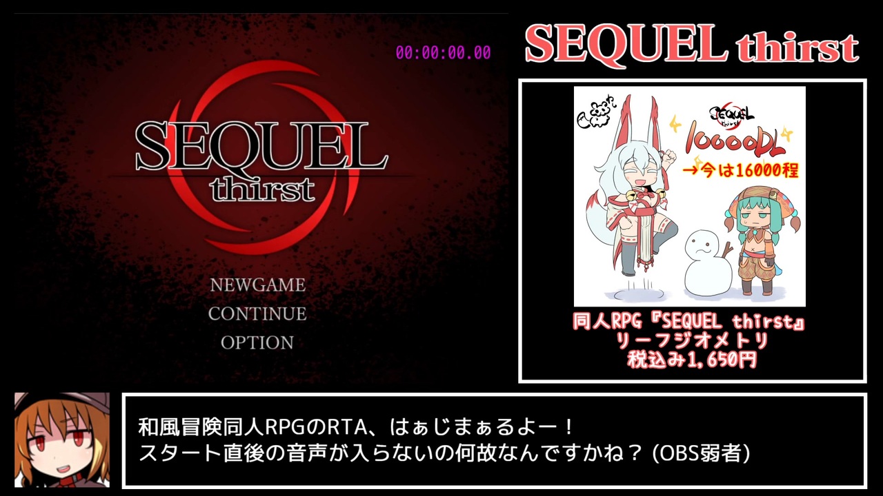 <strong>※本編のネタバレを含みます※</strong><br><br>発売一周年記念なので初投稿です。<br><br>Part2→<a href="https://www.nicovideo.jp/watch/sm45479780" class="watch">sm45479780</a><br><a href="https://www.nicovideo.jp/mylist/78896094" target="_blank" rel="noopener">mylist/78896094</a><br><br>無編集:<a href="https://youtu.be/tOefdRt0Pqw" target="_blank" rel="noopener nofollow">https://youtu.be/tOefdRt0Pqw</a><br><br>SEQUEL thirst<br>ttps://www.dlsite.com/maniax/work/=/product_id/RJ01225955.html<br>是非とも買っていただきたい!<br><br>// レギュレーション<br>計測区間 :「NewGame」押下からクリア後の「セーブしますか?」の選択肢表示まで<br>バージョン:Ver2.02で計測(最新版)<br><br>ヴィンテージクロップ兄貴、ゲン兄貴、氷袋兄貴、梅武兄貴、アストラ兄貴、<br>TAKU兄貴、にやとー兄貴、tonton兄貴、Reyji gentleman兄貴、AWA兄貴、<br>CV兄貴、彩鮫場兄貴、ミーコ360兄貴、ゲスト兄貴、細目魔王兄貴、篝火草@怜兄貴、<br>tka兄貴、TK兄貴、マカヒキちゃん兄貴、<br>広告ありがとナス!<br>