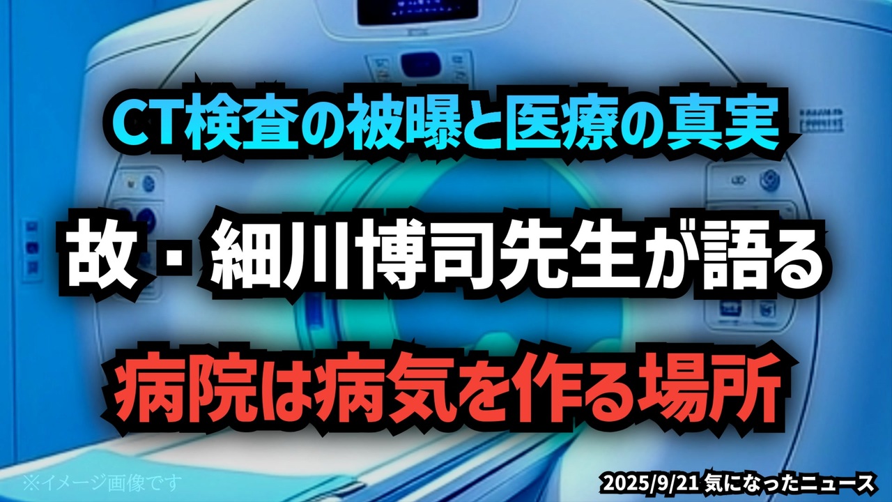◆ CT検査の被曝と医療の真実…故・細川博司先生が生前語った「病院は病気を作る場所」<br><br>日本の医療に対して強い警鐘を鳴らしてきた細川博司先生。その発言は、人間ドックやがん検診への批判から始まり、CT検査の被曝リスク、病院の役割、そしてがん治療のあり方まで多岐にわたります。<br><br>胸部レントゲンの被曝量は0.05〜0.1ミリシーベルトに対し、胸部CTは5〜7ミリシーベルト。50〜100倍の被曝量になります。先生は「病院は病気を治す場ではなく、病気を作る場」と断言し、放射線、手術、抗がん剤が命を奪っていると主張しました。<br><br>さらに「がんは怖くない」「治療で命を落としている」と語り、ファイザー敗訴や政治の支配構造にも言及。世界と日本の情報格差を問題視しました。<br><br>この動画では、先生の発言を事実に基づき整理し、医療のリスクと透明性を考える材料としてお届けします。<br><br><br>◆今回の台本(詳細)<a href="https://keiichiro8140.hatenablog.com/entry/25092111222" target="_blank" rel="noopener nofollow">https://keiichiro8140.hatenablog.com/entry/25092111222</a><br><br>◆YouTubeチャンネル登録よろしくお願いします🙏 <a href="https://www.youtube.com/@K16news888" target="_blank" rel="noopener nofollow">https://www.youtube.com/@K16news888</a><br><br>◆もしも(BAN)の時のためのマイリンク集<a href="https://lit.link/K16_888" target="_blank" rel="noopener nofollow">https://lit.link/K16_888</a><br><br>ご覧いただきありがとうございます<br>m(_ _)m<br>気になったニュース 2025/9/21<br><br />著作権、肖像権に配慮して作成しております。<br><br>◆気になったニュースの台本!?<br>メモ代わりに作った台本をそのままあげてます<br><a href="https://keiichiro8140.hatenablog.com/." target="_blank" rel="noopener nofollow">https://keiichiro8140.hatenablog.com/.</a><br><br><br>ここからはシリーズ紹介<br><br><br>◆ ワクチン解毒・デトックス<br><a href="https://x.gd/fZweg" target="_blank" rel="noopener nofollow">https://x.gd/fZweg</a><br><br>◆ウイリアム・マキス博士のがん治療(イベルメクチン・フェンベンダゾール等)<br><a href="https://x.gd/AtFYS" target="_blank" rel="noopener nofollow">https://x.gd/AtFYS</a><br><br>◆予防接種健康被害救済制度<br><a href="https://x.gd/0xK9x" target="_blank" rel="noopener nofollow">https://x.gd/0xK9x</a><br><br>◆気になったニュース #1501~<br><br>◆ 【ショートver】気になったニュース<br><a href="https://x.gd/7MxXC" target="_blank" rel="noopener nofollow">https://x.gd/7MxXC</a><br><br>◆ 気になったニュース #1001~<br><a href="https://x.gd/Lp8gv" target="_blank" rel="noopener nofollow">https://x.gd/Lp8gv</a><br><br>◆ 気になったニュース #501~<br><a href="https://x.gd/EmbS4" target="_blank" rel="noopener nofollow">https://x.gd/EmbS4</a><br><br>◆ 気になったニュース #1~#500<br><a href="https://x.gd/uPhNb" target="_blank" rel="noopener nofollow">https://x.gd/uPhNb</a><br><br>◆ X(旧Twitter)・テレグラムで気になった情報<br><a href="https://x.gd/YG6FT" target="_blank" rel="noopener nofollow">https://x.gd/YG6FT</a><br><br>◆ 日比谷5万人パレードデ⚪生放送アーカイブ動画<br><a href="https://x.gd/3CHJv" target="_blank" rel="noopener nofollow">https://x.gd/3CHJv</a><br><br>◆日比谷5万人パレード⚪モのマイリスト作ってみました<br><a href="https://nico.ms/mylist/76828848?ref=sp_other" target="_blank" rel="noopener nofollow">https://nico.ms/mylist/76828848?ref=sp_other</a><br><br>◆3.30 令和の百姓⚪⚪<br><a href="https://www.nicovideo.jp/series/511791?ref=garage_share_other" target="_blank" rel="noopener nofollow">https://www.nicovideo.jp/series/511791?ref=garage_share_other</a><br><br>◆ 及川幸久さんの【XNEWS】シリーズ<br><a href="https://x.gd/3k78K" target="_blank" rel="noopener nofollow">https://x.gd/3k78K</a><br><br>◆これまでの動画<a href="https://x.gd/sPXoJ" target="_blank" rel="noopener nofollow">https://x.gd/sPXoJ</a><br><br>◆もしも(BAN)の時のためのマイリンク集<a href="https://lit.link/K-16_News44" target="_blank" rel="noopener nofollow">https://lit.link/K-16_News44</a><br><br>