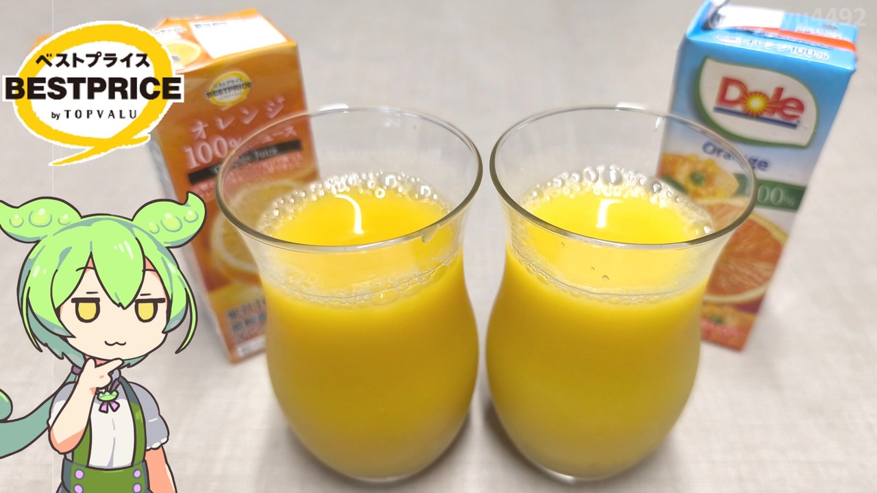 今回はドリンクコーナーにある200mlサイズの<br>オレンジ100%ジュースを飲み比べてみます。<br><br><br><br>【関連動画】<br>トップバリュの黄色いヤツ「ベストプライス オレンジ100%ジュース」(ユーチューブ)<br><a href="https://www.youtube.com/watch?v=L4GDyXZcwbA" target="_blank" rel="noopener nofollow">https://www.youtube.com/watch?v=L4GDyXZcwbA</a><br>日本で急増中の「オレンジジュースの自動販売機」2024.06.08<br><a href="https://www.nicovideo.jp/watch/sm43884709" target="_blank" rel="noopener nofollow">https://www.nicovideo.jp/watch/sm43884709</a><br><br>【参考】<br>オレンジ100%ジュース※本体価格128円/200ml(トップバリュ)<br><a href="https://www.topvalu.net/items/detail/4549414691320/" target="_blank" rel="noopener nofollow">https://www.topvalu.net/items/detail/4549414691320/</a><br>Doleオレンジ100%(雪印メグミルク)<br><a href="https://www.meg-snow.com/products/detail.php?p=dole_orange200" target="_blank" rel="noopener nofollow">https://www.meg-snow.com/products/detail.php?p=dole_orange200</a><br>オレンジジュースに異変?2024.06.10(NHK)<br><a href="https://www3.nhk.or.jp/news/html/20240610/k10014476001000.html" target="_blank" rel="noopener nofollow">https://www3.nhk.or.jp/news/html/20240610/k10014476001000.html</a><br>オレンジジュース、相次ぐ販売休止 <br>主産地のブラジルで不作 セブンはみかん果汁入りに 2024.05.21(産経新聞)<br><a href="https://www.sankei.com/article/20240521-VIRJ4ZCHUVMEVAXP3DA5H6ZTLY/" target="_blank" rel="noopener nofollow">https://www.sankei.com/article/20240521-VIRJ4ZCHUVMEVAXP3DA5H6ZTLY/</a><br>令和5年度事業報告(日本果汁境界)※PDFファイル<br><a href="http://www.kaju-kyo.ecnet.jp/MyPage/koukaizyouhou/05zigyouhoukoku.pdf" target="_blank" rel="noopener nofollow">http://www.kaju-kyo.ecnet.jp/MyPage/koukaizyouhou/05zigyouhoukoku.pdf</a><br>世界を明るいDole色に染めていきたい|株式会社ドール社長インタビュー2024.07.23(Dole)<br><a href="https://www.dole.co.jp/magazine/0005" target="_blank" rel="noopener nofollow">https://www.dole.co.jp/magazine/0005</a><br><br>【使用した素材】(※敬称略) <br>(合成音声)VOICEVOX/ずんだもん/四国めたん<br><a href="https://voicevox.hiroshiba.jp/" target="_blank" rel="noopener nofollow">https://voicevox.hiroshiba.jp/</a> <br>(立ち絵)坂本アヒル<br> <a href="https://seiga.nicovideo.jp/seiga/im10788496?track" target="_blank" rel="noopener nofollow">https://seiga.nicovideo.jp/seiga/im10788496?track</a><br>(楽曲)甘茶の音楽工房/「楽しい麦畑」「フルーツパフェ」「お城の舞踏会」<br><a href="https://amachamusic.chagasi.com/" target="_blank" rel="noopener nofollow">https://amachamusic.chagasi.com/</a>