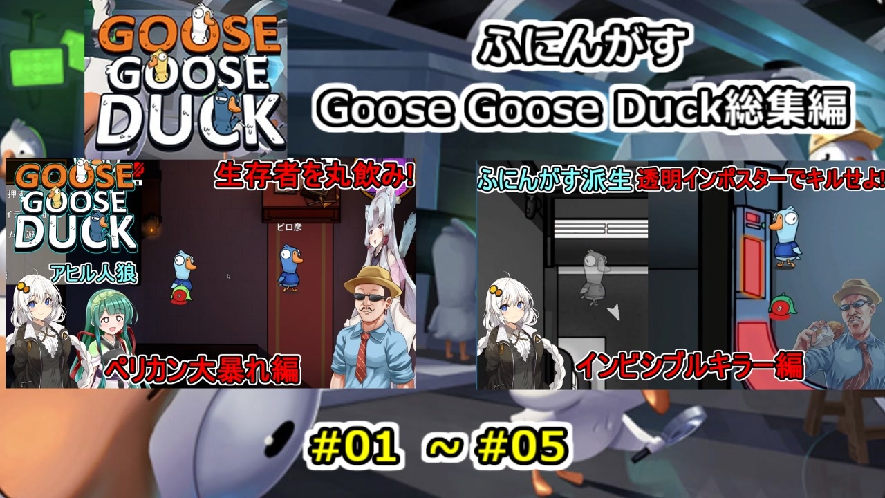 <a href="#" class="seekTime" data-seekTime="00:00" onclick="seekNicoPlayer('#00:00'); return false;">#00:00</a> #01 ふにんがすメンバーとアヒル人狼!VS生存者を丸飲みして暴れるペリカン編<br><a href="#" class="seekTime" data-seekTime="06:23" onclick="seekNicoPlayer('#06:23'); return false;">#06:23</a> #02 暴走する正義の鉄槌編<br><a href="#" class="seekTime" data-seekTime="12:34" onclick="seekNicoPlayer('#12:34'); return false;">#12:34</a> #03 大量丸飲みペリカン編<br><a href="#" class="seekTime" data-seekTime="18:07" onclick="seekNicoPlayer('#18:07'); return false;">#18:07</a> #04 幽体離脱で壁を抜けろ!編<br><a href="#" class="seekTime" data-seekTime="23:48" onclick="seekNicoPlayer('#23:48'); return false;">#23:48</a> #05 透明インポスターでキルせよ編<br><br>ボイロ・CeVIO実況者をメインとした宇宙人狼ゲーム「Among Us」の大規模コラボの「ふにんがす」が「Goose Goose Duck」をプレイ!<br>その凪尾視点の動画の総集編<br>#01 ~ #05 となっています<br><br>YouTube高画質版:<a href="https://youtu.be/tc0LgElsDDg" target="_blank" rel="noopener nofollow">https://youtu.be/tc0LgElsDDg</a><br><br>超会議グッズ通販中!<br><a href="https://nagio-gta25252.booth.pm/" target="_blank" rel="noopener nofollow">https://nagio-gta25252.booth.pm/</a><br>ニコニコクリエイターサポート<br><a href="https://creator-support.nicovideo.jp/registration/2620730" target="_blank" rel="noopener nofollow">https://creator-support.nicovideo.jp/registration/2620730</a><br>ニコニコチャンネル<br><a href="https://ch.nicovideo.jp/nagio-gta?ref=pc_mypage_top" target="_blank" rel="noopener nofollow">https://ch.nicovideo.jp/nagio-gta?ref=pc_mypage_top</a><br>ニコニコパートナーパス<br><a href="https://nicoft.io/" target="_blank" rel="noopener nofollow">https://nicoft.io/</a><br>(↑いずれか加入でリスナー参加型専用ゲームサーバーにアクセスできるぞ!)<br><br>Twitter:<a href="https://twitter.com/naoreisen" target="_blank" rel="noopener nofollow">https://twitter.com/naoreisen</a><br> <br><br>前回 ふにんがすガンダムファイブボンバーPart2:<a href="https://www.nicovideo.jp/watch/sm45346561" class="watch">sm45346561</a><br>前回 ふにんがす:AmongUs:奇跡のギャンブラー編:<a href="https://www.nicovideo.jp/watch/sm45328403" class="watch">sm45328403</a><br>前回 GTA5:カオス磯野モード:地獄研究所前編:<a href="https://www.nicovideo.jp/watch/sm45316442" class="watch">sm45316442</a><br>前回 パーティアニマルズ:イタズラ妨害狸編:<a href="https://www.nicovideo.jp/watch/sm45113701" class="watch">sm45113701</a><br>前回 GTA5手配度MAX:ガンダムジークアクス編:<a href="https://www.nicovideo.jp/watch/sm44705857" class="watch">sm44705857</a><br>前回 凪尾クラフト:トライアルチャンバー編:<a href="https://www.nicovideo.jp/watch/sm44573824" class="watch">sm44573824</a><br>前回 猫ミームブラック企業動画:<a href="https://www.nicovideo.jp/watch/sm43364794" class="watch">sm43364794</a><br>前回 GTA動画:KICK BACK PV再現:<a href="https://www.nicovideo.jp/watch/sm41527305" class="watch">sm41527305</a><br>