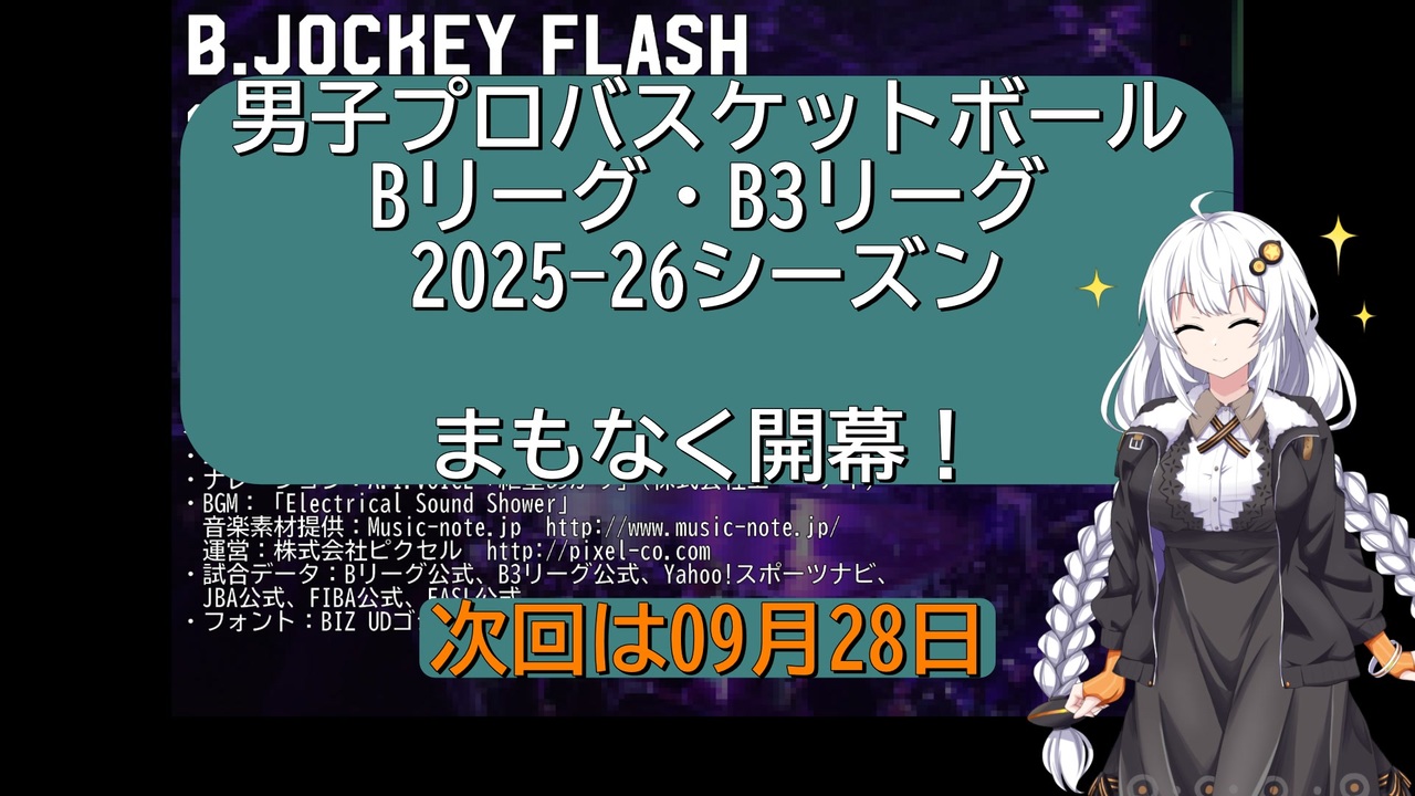 男子プロバスケットボール Bリーグ、B3リーグの結果をサクッと振り返り。<br>日本代表の公式試合も振り返り。<br><br>Bリーグ(B1、B2)<br><a href="https://www.bleague.jp/" target="_blank" rel="noopener nofollow">https://www.bleague.jp/</a><br>B3リーグ<br><a href="https://www.b3league.jp/" target="_blank" rel="noopener nofollow">https://www.b3league.jp/</a><br><br>9/26からB3リーグを皮切りに、Bリーグが始まりますよ~<br>ってことで、バスケとBリーグについてサクッと解説しつつ、開幕節のカードを紹介します。<br><br><a href="#" class="seekTime" data-seekTime="00:16" onclick="seekNicoPlayer('#00:16'); return false;">#00:16</a> バスケのルール<br><a href="#" class="seekTime" data-seekTime="02:31" onclick="seekNicoPlayer('#02:31'); return false;">#02:31</a> Bリーグ・B3リーグ<br><a href="#" class="seekTime" data-seekTime="06:25" onclick="seekNicoPlayer('#06:25'); return false;">#06:25</a> 観戦方法<br><a href="#" class="seekTime" data-seekTime="08:38" onclick="seekNicoPlayer('#08:38'); return false;">#08:38</a> 各リーグ開幕節のカード<br><br><br>次回は9/28。<br><br>本編のFriday B.JOCKEY 2025-26は、りそなグループBリーグ 開催期間中の毎週金曜日23:45から生放送。<br>ニコニコ動画には同日25:00に公開予定です。<br><br>----<br><使用素材CREDIT><br>ニコニコモンズ:<a href="https://commons.nicovideo.jp/works/nc210713" target="_blank" rel="noopener">nc210713</a>,<a href="https://commons.nicovideo.jp/works/nc367832" target="_blank" rel="noopener">nc367832</a>,<a href="https://commons.nicovideo.jp/works/nc299191" target="_blank" rel="noopener">nc299191</a>,<a href="https://commons.nicovideo.jp/works/nc160466" target="_blank" rel="noopener">nc160466</a>,<a href="https://commons.nicovideo.jp/works/nc102252" target="_blank" rel="noopener">nc102252</a>,<a href="https://commons.nicovideo.jp/works/nc209360" target="_blank" rel="noopener">nc209360</a>,<a href="https://commons.nicovideo.jp/works/nc292903" target="_blank" rel="noopener">nc292903</a>,<a href="https://commons.nicovideo.jp/works/nc292902" target="_blank" rel="noopener">nc292902</a><br>ナレーション:A.I.VOICE「紲星あかり」(株式会社エーアイ)<br>BGM:「Electrical Sound Shower」<br> 音楽素材提供:Music-Note.jp URL:<a href="http://www.music-note.jp/" target="_blank" rel="noopener nofollow">http://www.music-note.jp/</a><br> 運営:株式会社ピクセル URL:<a href="http://pixel-co.com/" target="_blank" rel="noopener nofollow">http://pixel-co.com/</a><br><br>試合データ:Bリーグ公式サイト、B3リーグ公式サイト、Yahoo!スポーツナビ、JBA公式サイト、FIBA公式サイト、EASL公式サイト<br>フォント:UD BIZゴシック、GD-digit17LED-OTF<br><br><a target="_blank" href="https://qa.nicovideo.jp/faq/show/19424?site_domain=default" style="font-size: 13px;color: #657586; text-decoration: underline; line-height: 1.4">この動画は投稿者によって修正されました</a>