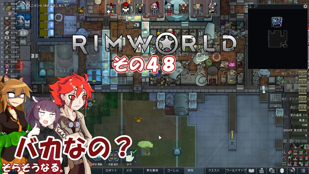 RIMWORLDの実況動画再開?でございます。<br>Ver1.6 アノマリー・バイオ・王侯貴族・イデオロギー・オデッセイDLCあり。<br>MODいっぱい!<br><br><a href="https://www.nicovideo.jp/watch/sm45423386" class="watch">sm45423386</a>← 前 次 → <a href="https://www.nicovideo.jp/watch/sm45457313" class="watch">sm45457313</a><br>マイリスト →<a href="https://www.nicovideo.jp/mylist/57448536" target="_blank" rel="noopener">mylist/57448536</a><br>作成動画その1リスト → <a href="https://www.nicovideo.jp/mylist/58364125" target="_blank" rel="noopener">mylist/58364125</a> <br><br>VOICEVOX:春日部つむぎ(ネコ耳) 九州そら(山城) 雨晴はう(妖夢) 青山龍星(ドラムカン) 東北きりたん(東北きりたん)<br>VOICEVOX他:中国うさぎ もち子(cv 明日葉よもぎ) No.7 四国めたん<br>Voiceroid:東北きりたん(立ち絵:このりEX様作 東北きりたん立ち絵素材5 <a href="https://seiga.nicovideo.jp/seiga/im10819054" target="_blank" rel="noopener">im10819054</a>)<br> 琴葉茜(立ち絵:戌田式琴葉姉妹立ち絵 Ver.2.2 <a href="https://seiga.nicovideo.jp/seiga/im11231844" target="_blank" rel="noopener">im11231844</a>)<br> 琴葉葵(立ち絵:戌田式琴葉姉妹立ち絵 Ver.2.2 <a href="https://seiga.nicovideo.jp/seiga/im11231844" target="_blank" rel="noopener">im11231844</a>)