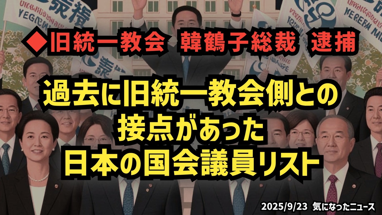 大変遅くなりました<br><br>【衆院選の参考に】◆韓鶴子逮捕と過去に旧統一教会側との接点が判明した日本の国会議員リスト<br><br> あらすじ<br>旧統一教会の韓鶴子総裁が逮捕されました。韓国特別検察官による捜査は、政治資金の不透明な流れにまで及び、日本でも波紋が広がっています。問題はこれで終わりではありません。長年にわたり「お墨付き」を与えてきた日本の国会議員たちの責任が、改めて問われています。被害者救済のための法整備や再発防止の仕組みづくりは進むのか。国民が注視する中、政界と旧統一教会の関係が、再び厳しく追及される局面を迎えています。<br><br>◆今回の台本(詳細)<a href="https://keiichiro8140.hatenablog.com/entry/25092333999" target="_blank" rel="noopener nofollow">https://keiichiro8140.hatenablog.com/entry/25092333999</a><br><br>◆YouTubeチャンネル登録よろしくお願いします🙏 <a href="https://www.youtube.com/@K16news888" target="_blank" rel="noopener nofollow">https://www.youtube.com/@K16news888</a><br><br>◆もしも(BAN)の時のためのマイリンク集<a href="https://lit.link/K16_888" target="_blank" rel="noopener nofollow">https://lit.link/K16_888</a><br><br>ご覧いただきありがとうございます<br>m(_ _)m<br>気になったニュース 2025/9/23<br><br />著作権、肖像権に配慮して作成しております。<br><br>◆気になったニュースの台本!?<br>メモ代わりに作った台本をそのままあげてます<br><a href="https://keiichiro8140.hatenablog.com/." target="_blank" rel="noopener nofollow">https://keiichiro8140.hatenablog.com/.</a><br><br><br>ここからはシリーズ紹介<br><br><br>◆ ワクチン解毒・デトックス<br><a href="https://x.gd/fZweg" target="_blank" rel="noopener nofollow">https://x.gd/fZweg</a><br><br>◆ウイリアム・マキス博士のがん治療(イベルメクチン・フェンベンダゾール等)<br><a href="https://x.gd/AtFYS" target="_blank" rel="noopener nofollow">https://x.gd/AtFYS</a><br><br>◆予防接種健康被害救済制度<br><a href="https://x.gd/0xK9x" target="_blank" rel="noopener nofollow">https://x.gd/0xK9x</a><br><br>◆気になったニュース #1501~<br><br>◆ 【ショートver】気になったニュース<br><a href="https://x.gd/7MxXC" target="_blank" rel="noopener nofollow">https://x.gd/7MxXC</a><br><br>◆ 気になったニュース #1001~<br><a href="https://x.gd/Lp8gv" target="_blank" rel="noopener nofollow">https://x.gd/Lp8gv</a><br><br>◆ 気になったニュース #501~<br><a href="https://x.gd/EmbS4" target="_blank" rel="noopener nofollow">https://x.gd/EmbS4</a><br><br>◆ 気になったニュース #1~#500<br><a href="https://x.gd/uPhNb" target="_blank" rel="noopener nofollow">https://x.gd/uPhNb</a><br><br>◆ X(旧Twitter)・テレグラムで気になった情報<br><a href="https://x.gd/YG6FT" target="_blank" rel="noopener nofollow">https://x.gd/YG6FT</a><br><br>◆ 日比谷5万人パレードデ⚪生放送アーカイブ動画<br><a href="https://x.gd/3CHJv" target="_blank" rel="noopener nofollow">https://x.gd/3CHJv</a><br><br>◆日比谷5万人パレード⚪モのマイリスト作ってみました<br><a href="https://nico.ms/mylist/76828848?ref=sp_other" target="_blank" rel="noopener nofollow">https://nico.ms/mylist/76828848?ref=sp_other</a><br><br>◆3.30 令和の百姓⚪⚪<br><a href="https://www.nicovideo.jp/series/511791?ref=garage_share_other" target="_blank" rel="noopener nofollow">https://www.nicovideo.jp/series/511791?ref=garage_share_other</a><br><br>◆ 及川幸久さんの【XNEWS】シリーズ<br><a href="https://x.gd/3k78K" target="_blank" rel="noopener nofollow">https://x.gd/3k78K</a><br><br>◆これまでの動画<a href="https://x.gd/sPXoJ" target="_blank" rel="noopener nofollow">https://x.gd/sPXoJ</a><br><br>◆もしも(BAN)の時のためのマイリンク集<a href="https://lit.link/K-16_News44" target="_blank" rel="noopener nofollow">https://lit.link/K-16_News44</a><br><br>