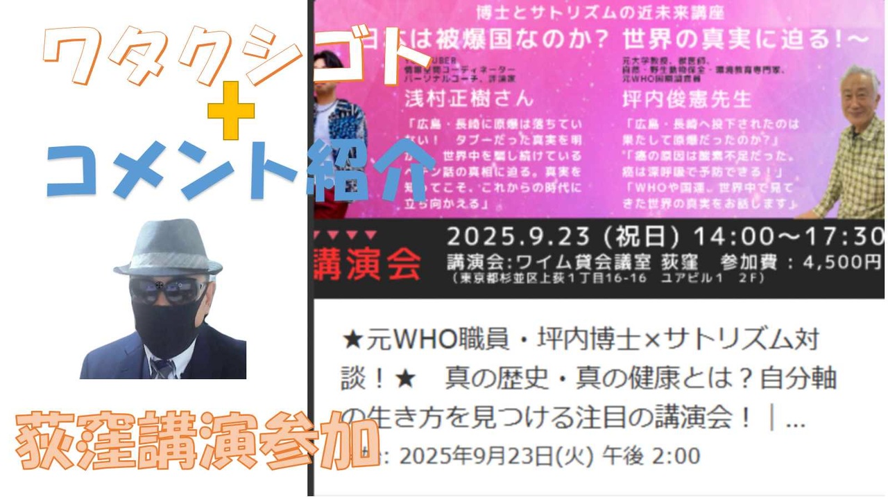 【浅村正樹】<br>Q アドレノクロム:食物連鎖の頂点(人間の上)?<br>A 8000年前はそうだったでしょうが、それから混血した。<br><br>・・半分神・半分人間のタイタンの逆襲みたいな話になるのか?<br><br>江戸時代で日本人としての国は終わった。<br>1945年に米国が落とした爆弾は「核」ではなかった。<br>(以前の動画を参照)<br><br>急いでいたのは日独が先に核兵器を開発する可能性があるから。<br><br><br><br>【坪内俊憲】<br>原子爆弾から癌、人口削減計画を考える<br>2025年9月23日<br><br>学校教育による洗脳成果<br>なぜ、日本は戦争したのか?できたのか?<br>世界にイギリスという国さえなければ世界は平和だった・・<br><br>イギリス外交の知人は、<br>英国は800年ローマ・200年ゲルマン人の植民地だった<br>だから、世界を植民地にする権利がある。<br><br>植民地支配:綿花・とうもろこしを収穫してくるなど<br>ノルマを達成できなかったら子供の手首を切ってくる。<br>手首が通貨として流通する。<br><br>日本は核兵器の実験に成功した、というロシアの報道(新聞記事)<br><br>アフリカ人は日本が好き、マレーシア・ベトナムも。<br><br>阪神淡路大震災:橋を作るうえで穴を掘る。<br>水蒸気爆発が大きい。<br><br><br>◆歴史<br>記録さえなければ、事実を消すことができる。<br>図書館を接収して、記録を燃やす。<br>前の王朝の血族を全員殺す(記憶を消す)<br>万人塚<br><br>真実は一つ(名探偵コナン)・・間違い<br>事実をどの切り口で見るか、て真実は異なる(複数)<br><br>◆病気<br><br>チャイナスタディ<br>・肉を食べる人のほうが癌が多い。<br>・癌の定義のWHO・厚労省・文部科学省で別々。<br>わざと誤差の大きい観測方法を取る。<br><br><br><br>◆自然に暮らす<br>モンゴルスタディ<br>・半年は肉・半年は乳製品<br>野菜は食べない(草と同じ扱い)<br>きゅうりは全部家畜にあげてしまった<br><br><br>◆健康診断<br>日本のように男性のほうが寿命が短いのは<br>検診を受ける機会が多いから・・<br><br>・コレステロールは本来260くらいが良い。<br>・検診では異常値が出る。<br><br><br>◆歴史<br><br>最初の共産革命:フランス革命<br><br>日本は支配していない国<br>年貢はみかじめ料<br><br>◆健康方法<br>・発酵食品を夜に食べる(味噌・納豆)<br>
