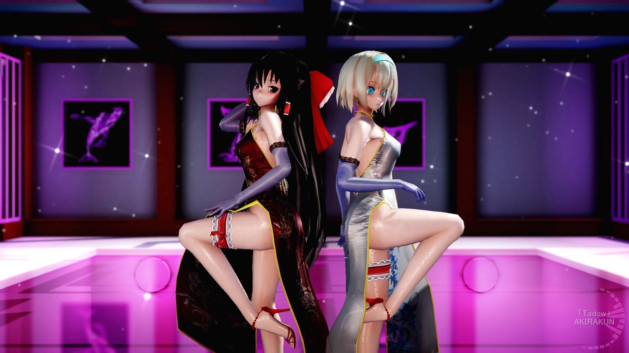 霊夢とアリスにチャイナ・ドレスで踊ってもらいました。この作品は「東方project」の2次創作です。現在、作成リクエストは受け付けていません。<br><br><br>【楽曲】:「Tadow / Masego & FKJ」<br><a href="https://www.youtube.com/watch?v=hC8CH0Z3L54" target="_blank" rel="noopener nofollow">https://www.youtube.com/watch?v=hC8CH0Z3L54</a><br><br>【トレス元】<br><a href="https://www.youtube.com/watch?v=bWaAB7ju7Mk" target="_blank" rel="noopener nofollow">https://www.youtube.com/watch?v=bWaAB7ju7Mk</a><br><br>【モーション】:JULI 様<br><a href="https://www.youtube.com/watch?v=lahMz9WGg5g" target="_blank" rel="noopener nofollow">https://www.youtube.com/watch?v=lahMz9WGg5g</a><br><br>【カメラ】:AKIRAKUN ・・・・作ってみました。<br><br><br>■ステージ<br>ネオンルーム:ばんぞく様 <a href="https://seiga.nicovideo.jp/seiga/im11672013" target="_blank" rel="noopener">im11672013</a><br><br>■モデル<br>霊夢、アリス:にがもん様、しえら様<br>・衣装:アールビット様<br><br>■エフェクト<br>Ray-mmd-1.5.2:Rui様<br>初心者マテリアル:さらしな様<br>肌マテリアル:MARUSU様<br>AutoLuminous4:そぼろ様<br>水面エフェクト:ビームマンP様<br>空中に漂う埃:化身バレッタ様<br>ikBokeh_v020a:ikeno様<br><br><br>MikuMikuDance:樋口優様<br>MMEffect :舞力介入P様<br>PMDE、PmxE:極北P様<br>AviUtl :KENくん様<br>・Aviutl + x264guiExでエンコード:rigaya様<br>Ut Video Codec suite:ゆーむP様<br>上海アリス幻楽団・東方project(ZUN様)<br><br><br>mylist ③<a href="https://www.nicovideo.jp/mylist/75586824" target="_blank" rel="noopener">mylist/75586824</a> ② <a href="https://www.nicovideo.jp/mylist/72970530" target="_blank" rel="noopener">mylist/72970530</a> ① <a href="https://www.nicovideo.jp/mylist/63690967" target="_blank" rel="noopener">mylist/63690967</a> 旧 <a href="https://www.nicovideo.jp/mylist/61238351" target="_blank" rel="noopener">mylist/61238351</a><br><br> ※動画の転載は禁止です。<br>Attention,Unauthorized reproduction prohibited!!