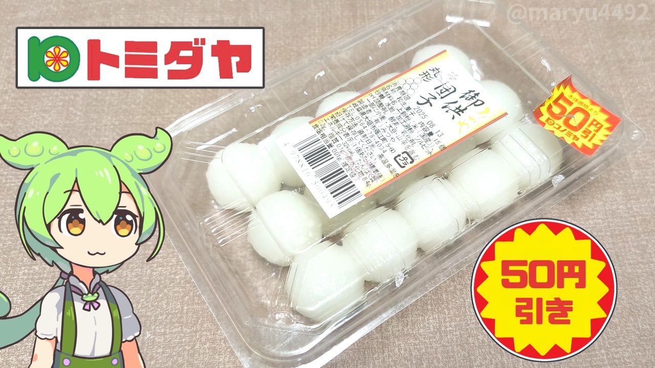 お盆の頃に、トミダヤで白いお供え団子を買いました。<br>どうやらお供えするお団子には意味があるそうで…<br>(※お供え団子の定価:198円)<br><br><br>【前回のトミダヤ動画】<br>トップバリュでお馴染み、大徳食品の自社商品「大盛りぶっかけきしめん(100円引き)」2025.09.19<br><a href="https://www.nicovideo.jp/watch/sm45413479" target="_blank" rel="noopener nofollow">https://www.nicovideo.jp/watch/sm45413479</a><br><br>【参考】<br>お盆に団子をお供えする理由とは?団子の種類や作り方をご紹介2022.07.29(デリッシュキッチン)<br><a href="https://delishkitchen.tv/articles/1781" target="_blank" rel="noopener nofollow">https://delishkitchen.tv/articles/1781</a><br>お盆の定番料理とは?精進料理などのお供え物やタブー2025.04.24(お仏壇のはせがわ)<br><a href="https://www.hasegawa.jp/blogs/kuyou/obon-food" target="_blank" rel="noopener nofollow">https://www.hasegawa.jp/blogs/kuyou/obon-food</a><br>お盆にお供えする団子の意味とは?作り方やお供えの際の注意点を紹介 2022.08.06(みんなが選んだ終活)<br><a href="https://www.eranda.jp/column/11968" target="_blank" rel="noopener nofollow">https://www.eranda.jp/column/11968</a><br><br>【使用した素材】(※敬称略)<br>(合成音声)VOICEVOX/ずんだもん/四国めたん<br><a href="https://voicevox.hiroshiba.jp/" target="_blank" rel="noopener nofollow">https://voicevox.hiroshiba.jp/</a><br>(立ち絵)坂本アヒル<br><a href="https://seiga.nicovideo.jp/seiga/m10788496/im10791276" target="_blank" rel="noopener nofollow">https://seiga.nicovideo.jp/seiga/m10788496/im10791276</a><br>(楽曲)甘茶の音楽工房/「日々是好日」「残業戦士」<br><a href="https://amachamusic.chagasi.com" target="_blank" rel="noopener nofollow">https://amachamusic.chagasi.com</a>