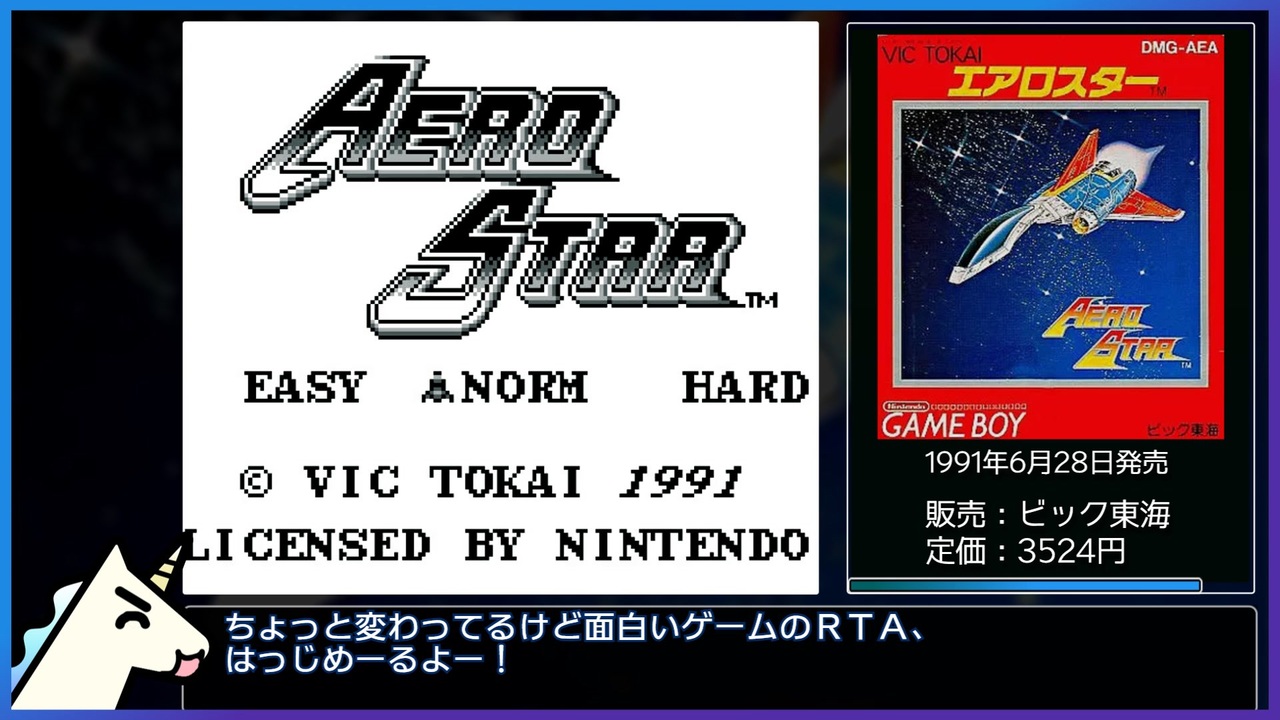 RTA第17弾は 1991年発売、ビック東海が販売したゲームボーイソフト『エアロスター』。<br>飛行機なのにジャンプして足場を乗り継ぐ、斬新な設定のシューティングです。<br><br>初見は違和感を覚えるもののプレイしてみると敵配置は考えられていますし、グラも良く、ジャンプのギミックも楽しい。<br>さらにBGMも両曲揃いと隠れた良ゲームだと思います。<br><br>前作【PS2】連ザⅡplus Aルート三周 →<a href="https://www.nicovideo.jp/watch/sm45159168" class="watch">sm45159168</a><br>part.2→<a href="https://www.nicovideo.jp/watch/sm45494695" class="watch">sm45494695</a><br><br>走ったRTAのpart.1まとめ→<a href="https://www.nicovideo.jp/mylist/73222388" target="_blank" rel="noopener">mylist/73222388</a><br>RTA全部まとめ→<a href="https://www.nicovideo.jp/mylist/72786007" target="_blank" rel="noopener">mylist/72786007</a><br><br><u>▽レギュレーション</u><br>タイマー開始:タイトル画面で難易度を選択した瞬間<br>タイマー終了:ラスボスを撃破した瞬間<br>(SpeedRun.comのレギュレーションに準じています)<br><br><u>▽プレイ環境</u><br>エミュレータ使用<br>録画ソフト:ロイロゲームレコーダー<br><br>〇Twitter(現:X)→@Nagisa381rta<br>〇Youtube→<a href="https://www.youtube.com/@nagisa381rta" target="_blank" rel="noopener nofollow">https://www.youtube.com/@nagisa381rta</a><br>〇FANBOX→<a href="https://nagisa381.fanbox.cc/" target="_blank" rel="noopener nofollow">https://nagisa381.fanbox.cc/</a><br>〇欲しいものリスト<br>→<a href="https://www.amazon.jp/hz/wishlist/ls/1S72L30BVRILK?ref_=wl_share" target="_blank" rel="noopener nofollow">https://www.amazon.jp/hz/wishlist/ls/1S72L30BVRILK?ref_=wl_share</a>