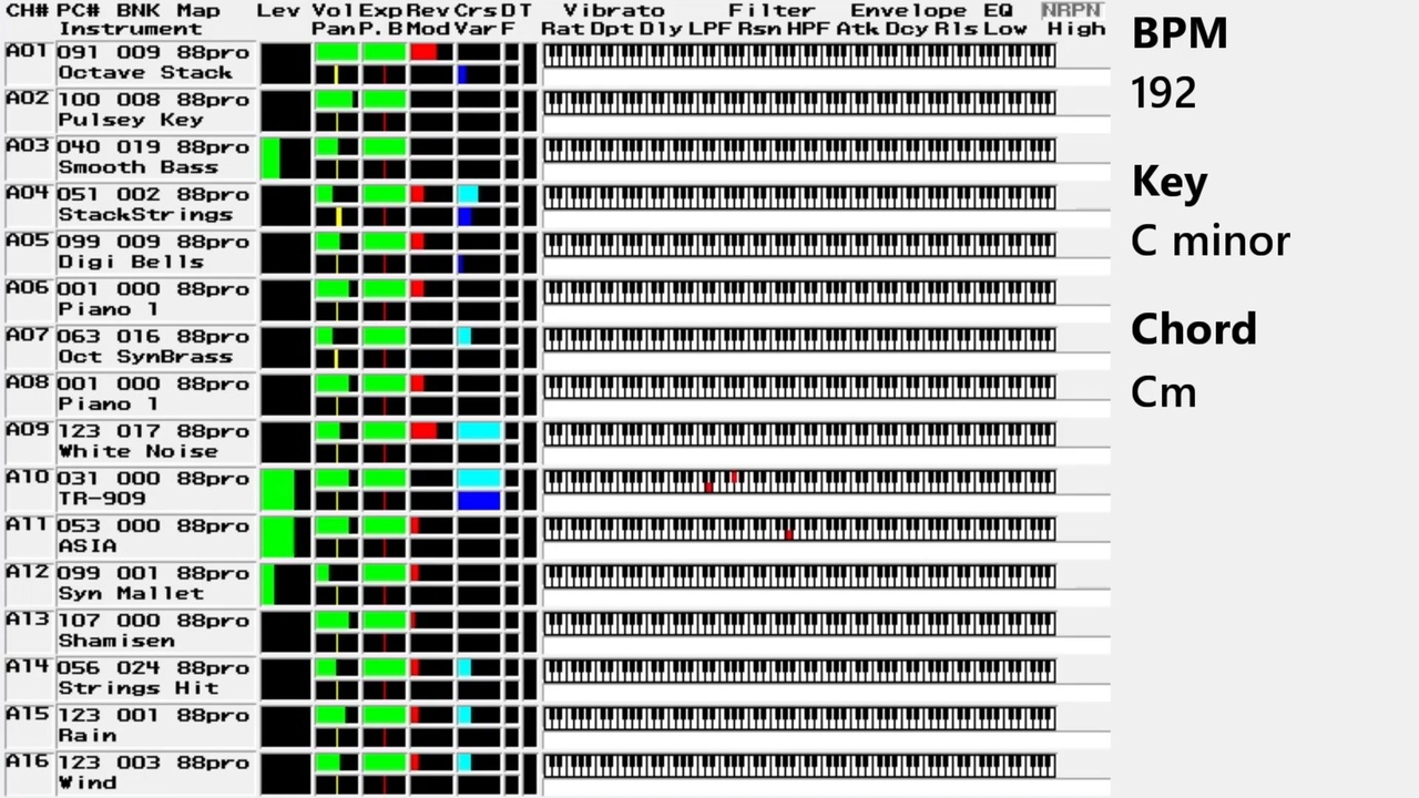 <span style="font-size: 16px;">ダウンロード</span><br><a href="https://drive.google.com/drive/folders/1DLGZAd4hfjX7474pEQFVEd-CghisERhh?usp=sharing" target="_blank" rel="noopener nofollow">https://drive.google.com/drive/folders/1DLGZAd4hfjX7474pEQFVEd-CghisERhh?usp=sharing</a><br>最終更新: 2025-11-01<br><br><a href="#" class="seekTime" data-seekTime="0:00" onclick="seekNicoPlayer('#0:00'); return false;">#0:00</a> 通常版<br><a href="#" class="seekTime" data-seekTime="5:55" onclick="seekNicoPlayer('#5:55'); return false;">#5:55</a> リズム合わせ部分抜き<br><br>原曲: <a href="https://www.nicovideo.jp/watch/sm19158004" class="watch">sm19158004</a><br><br><a href="https://www.nicovideo.jp/watch/sm32841166" class="watch">sm32841166</a>の改善版です。指摘大歓迎。シンセパッドは数十セント程度の深いデチューンがかかっており、実際より複雑なコードに聞こえることがあるようです。<br><br><span style="font-size: 16px;">修正した間違い</span><br>>>5 シンセベル(猫パート)の「E♭-CGC-F-」のGが1オクターブ低い<br>>>8,9,10 シンセリード(メロディー)のリズムが違う(後半の4か所も含む)<br>>>12 パルス波リードの最初の音符がわずかに早い<br>>>14,20 アルペジオが入っている部分でメロディーを演奏しているベル系のシンセが無い(指摘はこれの聞き間違いかも)<br>>>26 落ち着いている部分のベースとエレピの低音の一部が1オクターブ高い<br>* 落ち着いている部分の最後の2小節のエレピの高音が無い<br><br><span style="font-size: 16px;">確認できなかった指摘</span><br>>>18 シンセベル(猫パート)のGm7の小節の一拍目の裏の8分音符はGではなく<s>E♭</s>Dだと思います(以前ここに誤ってE♭と書いていましたがDのことです)<br>>>27 拍の裏の低音シンセは落ち着いている部分では鳴っていないと思います(それ以降の部分では元から鳴っています)<br>>>29 落ち着いている部分(特に最後の2小節)のベースに間違いを見つけられませんでした<br><br><span style="font-size: 16px;">補足</span><br>>>11,13 リズム合わせ部分はデータの可読性のために音の再現を妥協しています