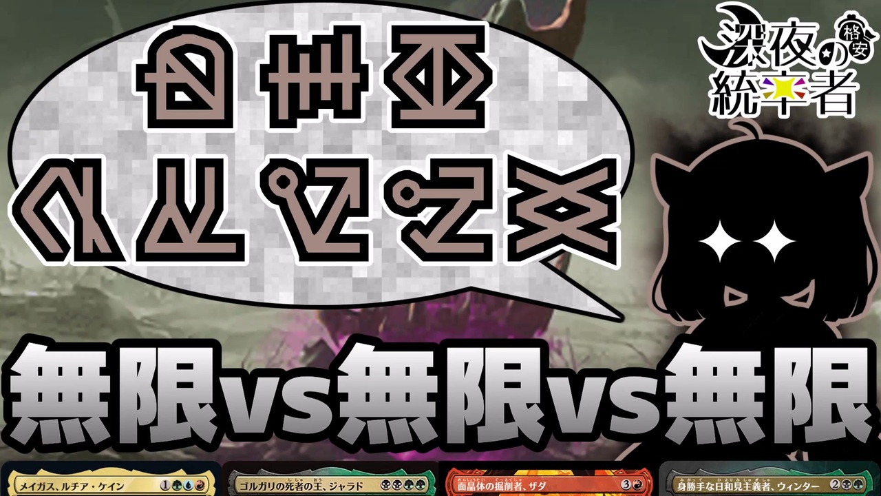 Magic: the Gatheringの統率者戦リプレイ動画です。<br>深夜にこっそり格安(当社比)デッキでロマンを求める人たちの対戦記録です。<br>なりふり構わず全速力でコンボ対決。<br><br>▶使用統率者<br> ・メイガス、ルチア・ケイン<br> (<a href="https://moxfield.com/decks/2HR1st-4jUGNAKQNKFstug)" target="_blank" rel="noopener nofollow">https://moxfield.com/decks/2HR1st-4jUGNAKQNKFstug)</a><br> ・ゴルガリの死者の王、ジャラド<br> ・面晶体の掘削者、ザダ<br> ・身勝手な日和見主義者、ウィンター<br />▶お借りした素材<br> ・VOICEVOX:冥鳴ひまり<br> ・VOICEVOX:春日部つむぎ<br> ・VOICEVOX:四国めたん<br> ・VOICEVOX:波音リツ<br> ・VOICEVOX:東北きりたん<br> ・魔王魂 様 (<a href="https://maou.audio/)" target="_blank" rel="noopener nofollow">https://maou.audio/)</a><br> ・効果音ラボ 様 (<a href="https://soundeffect-lab.info/)" target="_blank" rel="noopener nofollow">https://soundeffect-lab.info/)</a><br> ・moiky 様 (<a href="https://seiga.nicovideo.jp/clip/3329926)" target="_blank" rel="noopener nofollow">https://seiga.nicovideo.jp/clip/3329926)</a><br> ・イラストAC 様 (<a href="https://www.ac-illust.com/)" target="_blank" rel="noopener nofollow">https://www.ac-illust.com/)</a><br> ・動画AC 様 (<a href="https://video-ac.com" target="_blank" rel="noopener nofollow">https://video-ac.com</a>)<br> ・tktk 様(<a href="https://materialforwardvfx.wixsite.com/materialforward)" target="_blank" rel="noopener nofollow">https://materialforwardvfx.wixsite.com/materialforward)</a><br><br>▶Magic: the Gatheringについて<br> 『深夜の格安統率者』はファンコンテンツ・ポリシーに沿った非公式のファンコンテンツです。ウィザーズ社の認可/許諾は得ていません。題材の一部に、ウィザーズ・オブ・ザ・コースト社の財産を含んでいます。©Wizards of the Coast LLC.