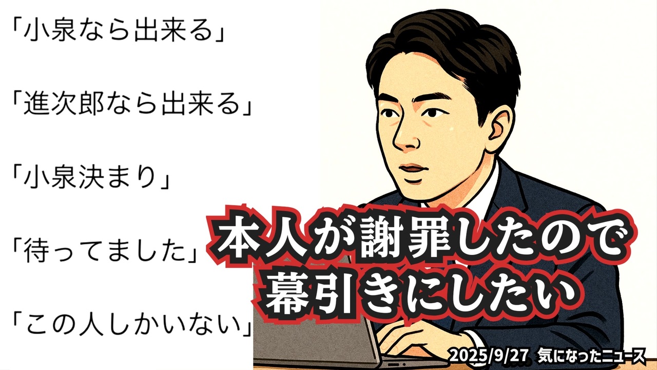 ◆小泉進次郎ステマ疑惑で陣営炎上 牧島かれん事務所班長辞任も「幕引き狙い」に批判集中<br><br>あらすじ<br>自民党総裁選に立候補した小泉進次郎農水相の陣営が、ネット上で小泉氏を称賛するコメントを投稿するよう関係者に要請していたことが発覚しました。牧島かれん元デジタル担当相の事務所が関与していたとされ、牧島氏は謝罪のうえ陣営の広報班長を辞任。小泉氏本人も謝罪しましたが、陣営は「影響は限定的」として幕引きを図る姿勢。一方、ライバル陣営は「総裁選の公正性を損なう重大問題」と強く反発し、党員票や選挙戦の行方に波紋が広がっています。<a href="https://www.sankei.com/article/20250926-TN63VY7DT5G2ZIAFO6L6ZTPIZM/" target="_blank" rel="noopener nofollow">https://www.sankei.com/article/20250926-TN63VY7DT5G2ZIAFO6L6ZTPIZM/</a><br>一つのIDで小泉氏賞賛500件以上 「えせ保守に負けるな」も ステマ要請動画投稿一覧 - 産経ニュース<br><br>牧島かれん<a href="https://x.com/yamazogaikuzo/status/1971465283660546108?t=zZvXJdVmZUrphf_rOHRk_w&s=19" target="_blank" rel="noopener nofollow">https://x.com/yamazogaikuzo/status/1971465283660546108?t=zZvXJdVmZUrphf_rOHRk_w&s=19</a><br><br>◆今回の台本(詳細)<a href="https://keiichiro8140.hatenablog.com/entry/25092777000" target="_blank" rel="noopener nofollow">https://keiichiro8140.hatenablog.com/entry/25092777000</a><br><br>◆YouTubeチャンネル登録よろしくお願いします🙏 <a href="https://www.youtube.com/@K16news888" target="_blank" rel="noopener nofollow">https://www.youtube.com/@K16news888</a><br><br>◆もしも(BAN)の時のためのマイリンク集<a href="https://lit.link/K16_888" target="_blank" rel="noopener nofollow">https://lit.link/K16_888</a><br><br>ご覧いただきありがとうございます<br>m(_ _)m<br>気になったニュース 2025/9/27<br><br />著作権、肖像権に配慮して作成しております。<br><br>◆気になったニュースの台本!?<br>メモ代わりに作った台本をそのままあげてます<br><a href="https://keiichiro8140.hatenablog.com/." target="_blank" rel="noopener nofollow">https://keiichiro8140.hatenablog.com/.</a><br><br><br>ここからはシリーズ紹介<br><br><br>◆ ワクチン解毒・デトックス<br><a href="https://x.gd/fZweg" target="_blank" rel="noopener nofollow">https://x.gd/fZweg</a><br><br>◆ウイリアム・マキス博士のがん治療(イベルメクチン・フェンベンダゾール等)<br><a href="https://x.gd/AtFYS" target="_blank" rel="noopener nofollow">https://x.gd/AtFYS</a><br><br>◆予防接種健康被害救済制度<br><a href="https://x.gd/0xK9x" target="_blank" rel="noopener nofollow">https://x.gd/0xK9x</a><br><br>◆気になったニュース #1501~<br><br>◆ 【ショートver】気になったニュース<br><a href="https://x.gd/7MxXC" target="_blank" rel="noopener nofollow">https://x.gd/7MxXC</a><br><br>◆ 気になったニュース #1001~<br><a href="https://x.gd/Lp8gv" target="_blank" rel="noopener nofollow">https://x.gd/Lp8gv</a><br><br>◆ 気になったニュース #501~<br><a href="https://x.gd/EmbS4" target="_blank" rel="noopener nofollow">https://x.gd/EmbS4</a><br><br>◆ 気になったニュース #1~#500<br><a href="https://x.gd/uPhNb" target="_blank" rel="noopener nofollow">https://x.gd/uPhNb</a><br><br>◆ X(旧Twitter)・テレグラムで気になった情報<br><a href="https://x.gd/YG6FT" target="_blank" rel="noopener nofollow">https://x.gd/YG6FT</a><br><br>◆ 日比谷5万人パレードデ⚪生放送アーカイブ動画<br><a href="https://x.gd/3CHJv" target="_blank" rel="noopener nofollow">https://x.gd/3CHJv</a><br><br>◆日比谷5万人パレード⚪モのマイリスト作ってみました<br><a href="https://nico.ms/mylist/76828848?ref=sp_other" target="_blank" rel="noopener nofollow">https://nico.ms/mylist/76828848?ref=sp_other</a><br><br>◆3.30 令和の百姓⚪⚪<br><a href="https://www.nicovideo.jp/series/511791?ref=garage_share_other" target="_blank" rel="noopener nofollow">https://www.nicovideo.jp/series/511791?ref=garage_share_other</a><br><br>◆ 及川幸久さんの【XNEWS】シリーズ<br><a href="https://x.gd/3k78K" target="_blank" rel="noopener nofollow">https://x.gd/3k78K</a><br><br>◆これまでの動画<a href="https://x.gd/sPXoJ" target="_blank" rel="noopener nofollow">https://x.gd/sPXoJ</a><br><br>◆もしも(BAN)の時のためのマイリンク集<a href="https://lit.link/K-16_News44" target="_blank" rel="noopener nofollow">https://lit.link/K-16_News44</a><br><br>