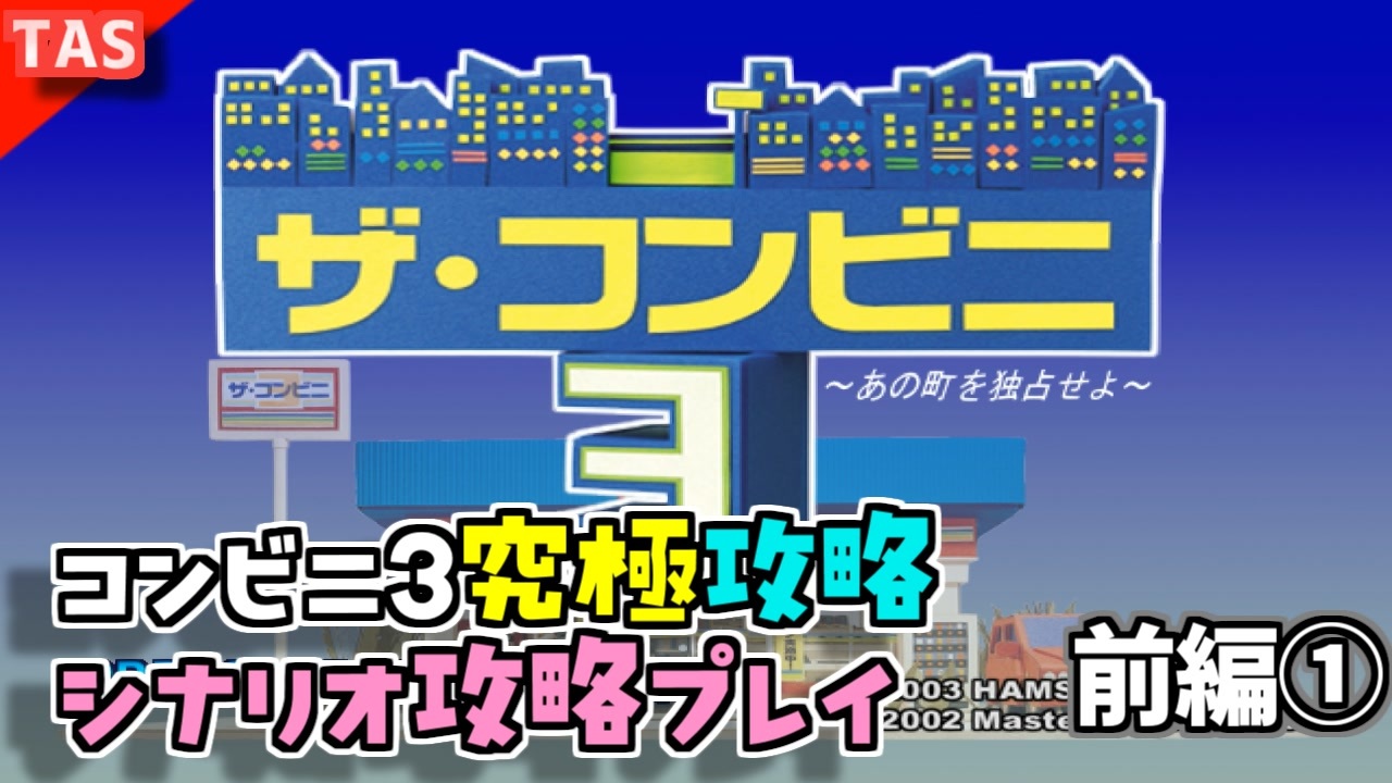 ザ・コンビニ3究極攻略<br>今までの知識を総動員してシナリオ2を攻略してみます。<br>※なお、建物の建設速度を1ヵ月とする代わりに、建設費用は縮めた月数分倍増させています<br><br>なお、TASと銘打ってますが、エミュレータでプレイし、どこでもセーブ機能を使って動画を作っていると言う程度の意味合いになります<br><br>ところで、今って30分で動画区切らなくてよくなったんでしたっけ?まぁいいや<br>前編②は1時間後(同日20時)に投稿予定です<br />動画に「いいね!」「マイリスト登録」よろしくお願いします。<br><br>・おすすめ<br>[TAS]Grand Theft Auto 3 Part1→<a href="https://www.nicovideo.jp/watch/sm14718961" class="watch">sm14718961</a><br>[TAS]MaxPayne デッドターゲット Part1→<a href="https://www.nicovideo.jp/watch/sm15093299" class="watch">sm15093299</a><br>[TAS]michigan Part1→<a href="https://www.nicovideo.jp/watch/sm18393230" class="watch">sm18393230</a><br><br>サポート頂けると励みになります<br>魔界塔士のサポーターになる→<a href="https://creator-support.nicovideo.jp/registration/15153622" target="_blank" rel="noopener nofollow">https://creator-support.nicovideo.jp/registration/15153622</a><br><br>TAS動画まとめ→<a href="https://koeiprogenitor.com/tas/matome/" target="_blank" rel="noopener nofollow">https://koeiprogenitor.com/tas/matome/</a><br>つべ→<a href="https://www.youtube.com/user/koeiprogenitor1/" target="_blank" rel="noopener nofollow">https://www.youtube.com/user/koeiprogenitor1/</a><br>インスタ→<a href="https://www.instagram.com/makaitoshi" target="_blank" rel="noopener nofollow">https://www.instagram.com/makaitoshi</a><br><br>本編→シリーズ一覧見てね<br>