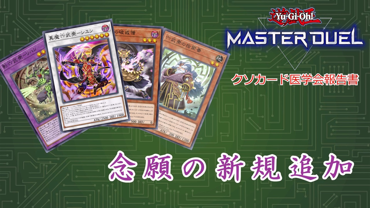 16本目です<br><br>大変遅くなり申し訳ありません…(2回目)<br><br><span style="color: #ff0000; font-size: 18px;"><strong>六武衆新規追加おめでとう!</strong></span><span style="color: #f3f3f3;"><strong><s>でもやっぱ追加遅くね?</s></strong></span><br><span style="color: #ff0000; font-size: 18px;"><strong>六武の門制限解除おめでとう!</strong></span><span style="color: #f3f3f3;"><strong><s>デッドネーダー禁止はよ</s></strong></span><br><br>8月に六武衆新規が追加されてからそれなりに遊んではいたんですが<br>色々あってMDを始めて過去最悪クラスでモチベが下がってました…<br><br>新規入り六武衆を触ってみた感想としてはこの環境だと無理じゃろ…と思っていたのですが<br>先行なら全然通用するので思ったよりは悪くないかな、といった感じです。<br><br><br>コメント、いいね、マイリスしていただけると励みになります。<br><br>あまくだり氏リスペクトです<br><br>使用音源<br>ニコニ・コモンズ<br><br>編集ソフト<br>ゆっくりムービーメーカー4<br>aviutl<br><br>使用楽曲<br>Funky droll street (蒲鉾さちこ様)<br>桜花 -小牧長久手- (戦国無双3)<br>KOTODAMA RUNNER(無双OROCHI 魔王再臨)<br><br>前≫<a href="https://www.nicovideo.jp/watch/sm45092242" class="watch">sm45092242</a>「フェニックス・ギア・フリード」<br>次≫模索中