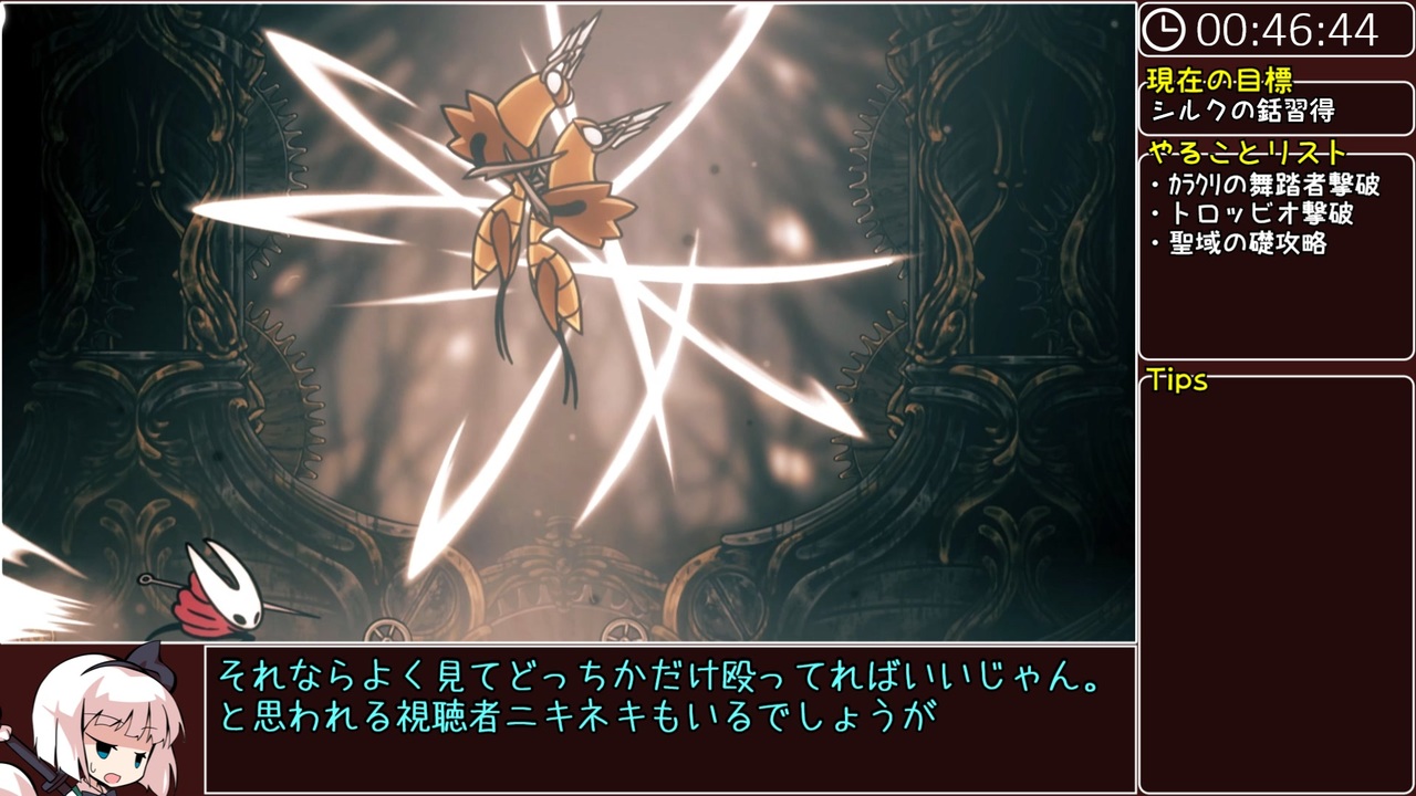 <a href="https://www.nicovideo.jp/watch/sm45438790" class="watch">sm45438790</a><前 <a href="https://www.nicovideo.jp/series/532208" target="_blank" rel="noopener">series/532208</a> 次><a href="https://www.nicovideo.jp/watch/sm45473105" class="watch">sm45473105</a><br><br>市民ランナーが走るRTA第15弾。<br>Steam版「Hollow Knight:Silksong」の通常エンドを目指すRTA動画です。<br>「一般人がRTA走者のまねごとをするとどうなるのか」<br>という試験的内容も含んでいますので<br>生暖かい目でご視聴ください<br>ーーーーーーーーーーーーーーーーーーーーーー<br>前走:エンダーマグノリアRTA(Any% Ending-A Normal) 1:38:24<br><a href="https://www.nicovideo.jp/watch/sm44624438" class="watch">sm44624438</a>