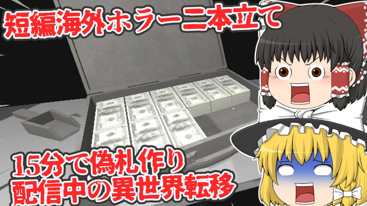 ゆっくり霊夢とゆっくり魔理沙が海外のホラーゲームに挑むようです。<br><br>本動画は東方Projectの二次創作です。 <br> <br>◎あらすじ◎<br>For the entity<br>謎の組織から15分で12万ドル分の偽札を作るよう命じられたあなた。<br>果たしてうまくいくのか…?<br><br>YO BRO, WHAT'S THAT IN YOUR MIRROR BRO?<br>あなたは配信者。いつものように配信を始めた貴方の配信画面に<br>不審な物が映る…<br><br>※投稿者のガバ翻訳付きです。<br>配信ページ <br><a href="https://mikeklubnika.itch.io/for-the-entity" target="_blank" rel="noopener nofollow">https://mikeklubnika.itch.io/for-the-entity</a><br><a href="https://campteam-games.itch.io/yo-bro-whats-that-in-your-mirror-bro" target="_blank" rel="noopener nofollow">https://campteam-games.itch.io/yo-bro-whats-that-in-your-mirror-bro</a><br><br>COEIROINK:誠聡ゲンキ<br><a href="https://coeiroink.com/" target="_blank" rel="noopener nofollow">https://coeiroink.com/</a><br><br>BGM・効果音をお借りしました。<br><a href="https://otologic.jp/" target="_blank" rel="noopener nofollow">https://otologic.jp/</a><br><br>立ち絵をお借りしました。<br><a href="https://seiga.nicovideo.jp/seiga/im10933652" target="_blank" rel="noopener nofollow">https://seiga.nicovideo.jp/seiga/im10933652</a><br><a href="https://seiga.nicovideo.jp/seiga/im11230837" target="_blank" rel="noopener nofollow">https://seiga.nicovideo.jp/seiga/im11230837</a><br><a href="https://seiga.nicovideo.jp/seiga/im11229020" target="_blank" rel="noopener nofollow">https://seiga.nicovideo.jp/seiga/im11229020</a><br><a href="https://seiga.nicovideo.jp/seiga/im4817713" target="_blank" rel="noopener nofollow">https://seiga.nicovideo.jp/seiga/im4817713</a><br>