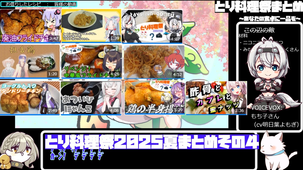 とり料理祭2025夏まとめ動画その4です。<br>参加して下さった皆様に感謝感謝!<br /><br>編集に使用させていただいているものは、プロフィールみてね!<br><a href="https://www.nicovideo.jp/user/311366" target="_blank" rel="noopener nofollow">https://www.nicovideo.jp/user/311366</a><br><br>読み上げ:VOICEVOX もち子(cv明日葉よもぎ)、ずんだもん、四国めたん、青山龍星、WhiteCUL、伊織弓鶴、COEIROINK:猫米茶<br><br><strong>過去の動画にコメント、いいね!、ギフト、広告、フォロー、マイリストありがとうございました!</strong><br><br>とり料理祭ありがとうございました!<br>2023参加作品はこちら ⇒ <a href="https://www.nicovideo.jp/mylist/75430531" target="_blank" rel="noopener nofollow">https://www.nicovideo.jp/mylist/75430531</a><br>2024冬参加作品はこちら ⇒ <a href="https://www.nicovideo.jp/mylist/75862737" target="_blank" rel="noopener nofollow">https://www.nicovideo.jp/mylist/75862737</a><br>2024夏参加作品はこちら ⇒ <a href="https://www.nicovideo.jp/mylist/76572716" target="_blank" rel="noopener nofollow">https://www.nicovideo.jp/mylist/76572716</a><br>2025冬参加作品はこちら ⇒ <a href="https://www.nicovideo.jp/mylist/77171241" target="_blank" rel="noopener nofollow">https://www.nicovideo.jp/mylist/77171241</a><br>2025夏参加作品はこちら ⇒ <a href="https://www.nicovideo.jp/mylist/77600849" target="_blank" rel="noopener nofollow">https://www.nicovideo.jp/mylist/77600849</a><br><br>このその日ごとになんか出す定食屋か駄菓子屋のごとき動画を継続して投稿するために<br>スポンサーをひっそり募集しております、あなたも一口いかが?<br><a href="https://creator-support.nicovideo.jp/registration/311366" target="_blank" rel="noopener nofollow">https://creator-support.nicovideo.jp/registration/311366</a>