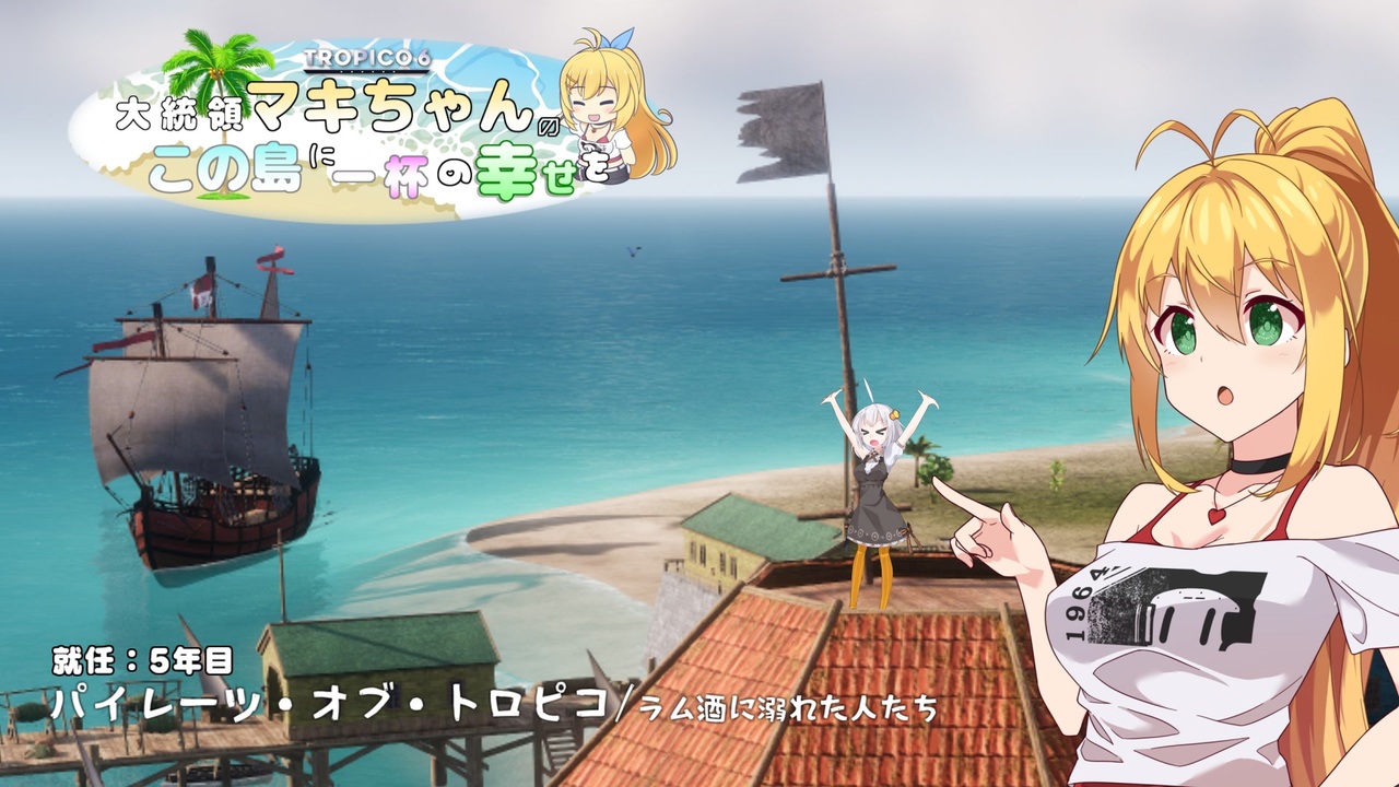 <strong>「ゲームだからこそ、私は大統領として、この島を幸せで一杯にしようと思うの」</strong><br><br>仮想空間に作られた南国のリゾート地。<br>そこには、ちょっと不思議な噂があった。<br>調査を始めたマキちゃんだったが、色々あってトロピコと呼ばれる謎のゲームを遊ぶことになってしまう。<br><br>ゲームの中で大統領になったマキちゃんは<br>元気なサポートAIあかりちゃんと一緒に島の開拓をするお話。<br><br>――――――――――――――<br>今回は、海賊のアジトが出来上がるまでの色々と<br>帝国との取引が始めて完了するお話です。<br>あと革命派とは別に、何やら謎の集団の活動が活発なようで……。<br><br>本来はドンドン作る部分ではあるんですが<br>遊劇場なので、色々と変なロールプレイが発生していますが<br>生暖かい目で楽しんで頂けたら幸いです。<br><br>6話:11月上旬に出せたらいいな……<br>4話:<a href="https://www.nicovideo.jp/watch/sm45348816" class="watch">sm45348816</a><br><br>本シリーズ<br>プロローグ:<a href="https://www.nicovideo.jp/watch/sm45012454" class="watch">sm45012454</a> パート1:<a href="https://www.nicovideo.jp/watch/sm45071292" class="watch">sm45071292</a> シリーズ:<a href="https://www.nicovideo.jp/series/514497" target="_blank" rel="noopener">series/514497</a> マイリスト:<a href="https://www.nicovideo.jp/mylist/78073198" target="_blank" rel="noopener">mylist/78073198</a><br><br>他シリーズは、パート1から