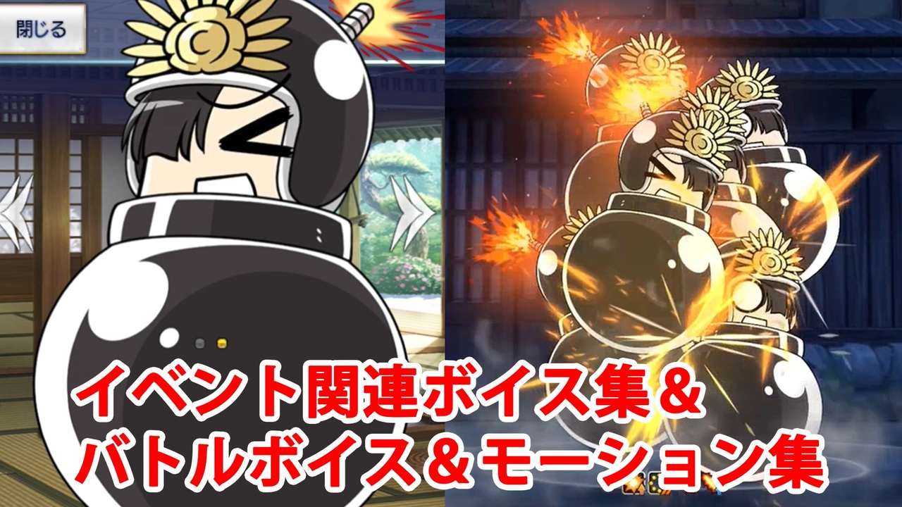 期間限定イベント「幕末チャンバラ神話 ぐだぐだ新選組・ジ・エンド REVENGE OF MAKOTO」でのボンバーノッブ(CV:釘宮理恵)のイベントショップの店番ボイスならびに<br>アタック、チャージアタック、スキル使用、被ダメージ、戦闘不能等のバトルボイスのまとめです。<br><br>チャージアタック「エクスノブージョン」<br><br>ショップボイスは投稿時点では原田左之助が離脱していた時期の期間限定です。<br><br>【チャプター】<br>0:00 イベントボイス(イベントショップ、アイテム交換)<br>0:56 バトルボイス&モーション集<br><br>※投稿済のモーション集が低音化していたので修正しています。<br><br>YouTube版はこちら<br><a href="https://www.youtube.com/watch?v=7yvp-jGfVrA" target="_blank" rel="noopener nofollow">https://www.youtube.com/watch?v=7yvp-jGfVrA</a><br><br />投稿済ボイス集→<a href="https://www.nicovideo.jp/mylist/57873980" target="_blank" rel="noopener">mylist/57873980</a>、<a href="https://www.nicovideo.jp/mylist/68037946" target="_blank" rel="noopener">mylist/68037946</a>、<a href="https://www.nicovideo.jp/mylist/76708013" target="_blank" rel="noopener">mylist/76708013</a>