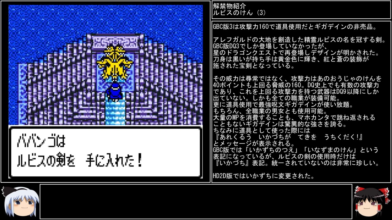DQⅢの3周目、GBCDQⅢ編part16です。<br><br>ぼくのかんがえたさいきょうのぐらんどらごーん<br>・毎ターン2回行動<br>・かがやくいき<br>・ギガデイン<br>・ザラキ<br>・メダパニ<br>・バシルーラ<br><br>……もしかして搦め手を使うバラモスって強かったのでは?<br><br><br>前→<a href="https://www.nicovideo.jp/watch/sm45458800" class="watch">sm45458800</a><br>次→<a href="https://www.nicovideo.jp/watch/sm45532592" class="watch">sm45532592</a><br><br>YouTube版→<a href="https://youtu.be/nlMIHq2ymWI" target="_blank" rel="noopener nofollow">https://youtu.be/nlMIHq2ymWI</a><br><br>縛りルール(詳細はpart1参照)<br>①一度使った武器・防具・装飾品・道具・呪文・特技は<br> 次作品以降使用禁止。(売却も解禁扱い)<br><br> 一度使った職業(3,6,7)・仲間モンスター(5,6)・スカウトモンスター(8)は<br> 戦士(Ⅲ)、戦士(Ⅵ)のようにナンバリングで分類し次作品以降使用禁止。<br> また複数体加入できる仲間モンスターは一体まで。<br><br>②裏技、バグ技、全滅、逃走、おどかす禁止。<br> またダンジョン攻略とボス戦における状況再現禁止。<br><br>③ダンジョンとボス攻略は、全キャラのレベルを突入時、<br> 1周目は目標レベル+5。2周目は+10。3周目は+15まで。<br> ラスボスの目標レベルは45。裏ボスは50とする。<br>(目標レベルは各公式ガイドブックを参照)<br><br>④1周目はEDまで。2周目は裏ボス撃破まで。<br> 3周目は全てのボスを規定回数、規定ターン以内に倒す。<br>(回避可能なボスも倒し、闇ゾーマは3周全てで倒す)<br><br><br><span style="color: #262626;">※一部機種は互換機を使用してのプレイとなりますが、倍速機能やクイックセーブ・ロード、チートなどは一切使用しません。</span><br><br>※ネタバレ注意です<br><br>この動画で利用している株式会社スクウェア・エニックスを代表とする共同著作者が権利を所有する著作物及びスギヤマ工房有限会社が権利を所有する楽曲の転載・配布は禁止いたします。<br>(C) ARMOR PROJECT/BIRD STUDIO/SQUARE ENIX All Rights Reserved.<br>(C) SUGIYAMA KOBO (P) SUGIYAMA KOBO<br><br>AquesTalk2ライセンスID:AQTK2WINUSR23122185<br /><br><br>❤いいねを押していただけるとモチベーションと投稿速度が上がるので宜しくお願い致します!<br><br>作者ツイッター→ <a href="https://twitter.com/nig0117" target="_blank" rel="noopener nofollow">https://twitter.com/nig0117</a><br>PIXIV FANBOX→ <a href="https://sutanokeiji.fanbox.cc/" target="_blank" rel="noopener nofollow">https://sutanokeiji.fanbox.cc/</a><br><br>( 以前はWEB小説書いてました→ <a href="https://kakuyomu.jp/works/1177354054884910267" target="_blank" rel="noopener nofollow">https://kakuyomu.jp/works/1177354054884910267</a> )