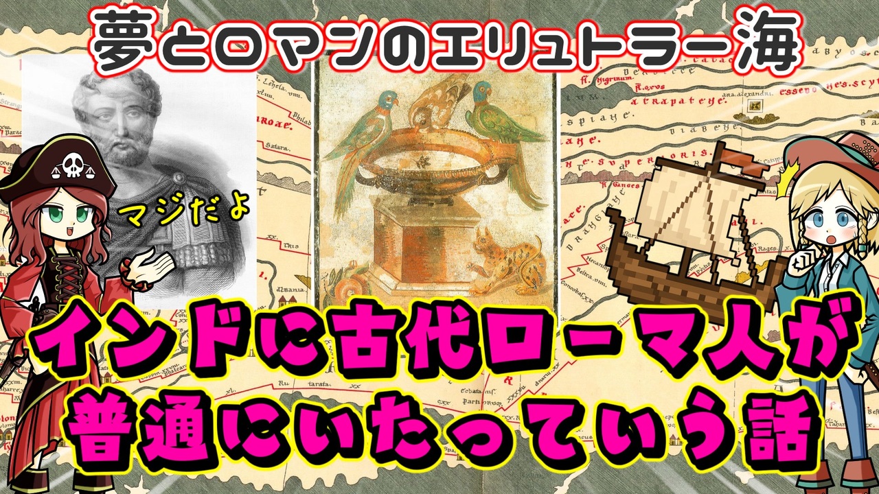 古代から意外と世界はグローバルだったんだね! <br><br>大航海時代のイメージが強すぎて、ヴァスコ・ダ・ガマ以前にはヨーロッパ人はインドに行ったことがないのかと思われるかもですが、普通に行ってました。なんならその1500年以上前からね。 <br>古代のローマとインドが思ったよりガッツリ絡んでいる話。 <br><br>☆ヒストリカの本が出るよ☆ 半径5メートルの世界史<br>→ <a href="https://amzn.to/3Vy0504" target="_blank" rel="noopener nofollow">https://amzn.to/3Vy0504</a><br><br>今回の参考文献: <br>(2016)『エリュトラー海案内記』蔀勇造訳註 平凡社<br>井上文則(2021)『シルクロードとローマ帝国の興亡』文藝春秋<br>小寺智津子(2023)『ガラスの来た道 古代ユーラシアをつなぐ輝き』吉川弘文館<br>前田耕作( 2019)『バクトリア王国の興亡』筑摩書房<br>安成哲三(2023)『モンスーンの世界 日本、アジア、地球の風土の未来可能性』中央公論新社<br><br>twitter | <a href="https://twitter.com/Yukkuri_mond" target="_blank" rel="noopener nofollow">https://twitter.com/Yukkuri_mond</a><br />━━━━━━━━━━━━━━━━━━━━━<br><br>この動画はクリエイティブ・コモンズ継承(CC-BY-SA)ライセンスの素材を使用して制作しています。(<a href="https://creativecommons.org/licenses/by-sa/4.0/)" target="_blank" rel="noopener nofollow">https://creativecommons.org/licenses/by-sa/4.0/)</a><br>規約に基づき、この動画もCC-BY-SA 4.0 のもとで公開します。<br><br>投稿者共通情報☆彡<br><br>BGM, SE:ニコニ・コモンズ様<br><a href="http://commons.nicovideo.jp/" target="_blank" rel="noopener nofollow">http://commons.nicovideo.jp/</a><br>魔王魂様<br><a href="https://maoudamashii.jokersounds.com/" target="_blank" rel="noopener nofollow">https://maoudamashii.jokersounds.com/</a><br>Audiostock様<br><a href="https://audiostock.jp/" target="_blank" rel="noopener nofollow">https://audiostock.jp/</a><br><br>立ち絵 霊夢・魔理沙(黒子式):nicotalk様<br><a href="http://www.nicotalk.com/charasozai.html" target="_blank" rel="noopener nofollow">http://www.nicotalk.com/charasozai.html</a><br><br>立ち絵 パトラ、マリー、アン、メアリ:ライフライフ様<br><a href="https://0801lifelife.tumblr.com/" target="_blank" rel="noopener nofollow">https://0801lifelife.tumblr.com/</a><br><br>使用ツール1:ゆっくりムービーメーカー4<br><a href="https://manjubox.net/ymm4/" target="_blank" rel="noopener nofollow">https://manjubox.net/ymm4/</a><br><br>使用ツール2:AviUtl<br><a href="http://spring-fragrance.mints.ne.jp/aviutl/" target="_blank" rel="noopener nofollow">http://spring-fragrance.mints.ne.jp/aviutl/</a><br><br>各時代の地図 : World History Maps & Timelines <br><a href="http://geacron.com/home-en/" target="_blank" rel="noopener nofollow">http://geacron.com/home-en/</a><br><br>ゆっくりボイスについて:AquesTalkライセンス取得済み<br><br>キャラクターボイス<br>アン・ボニー:羽ノ華(A.I.VOICE)<br>メアリ・リード:琴葉 葵(A.I.VOICE)<br>クレオパトラ:結月ゆかり(VOICEROID2)<br>マリー‐アントワネット:東北きりたん (VOICEROID EX)<br>その他キャラ:青山龍星(A.I.VOICE)、伊織弓鶴(A.I.VOICE2)、栗田まろん(A.I.VOICE)、宮舞モカ(VOICEPEAK)、フリモメン(VOICEPEAK)<br><br><br><br>その他フリー素材ご提供元の皆様に圧倒的感謝<br>
