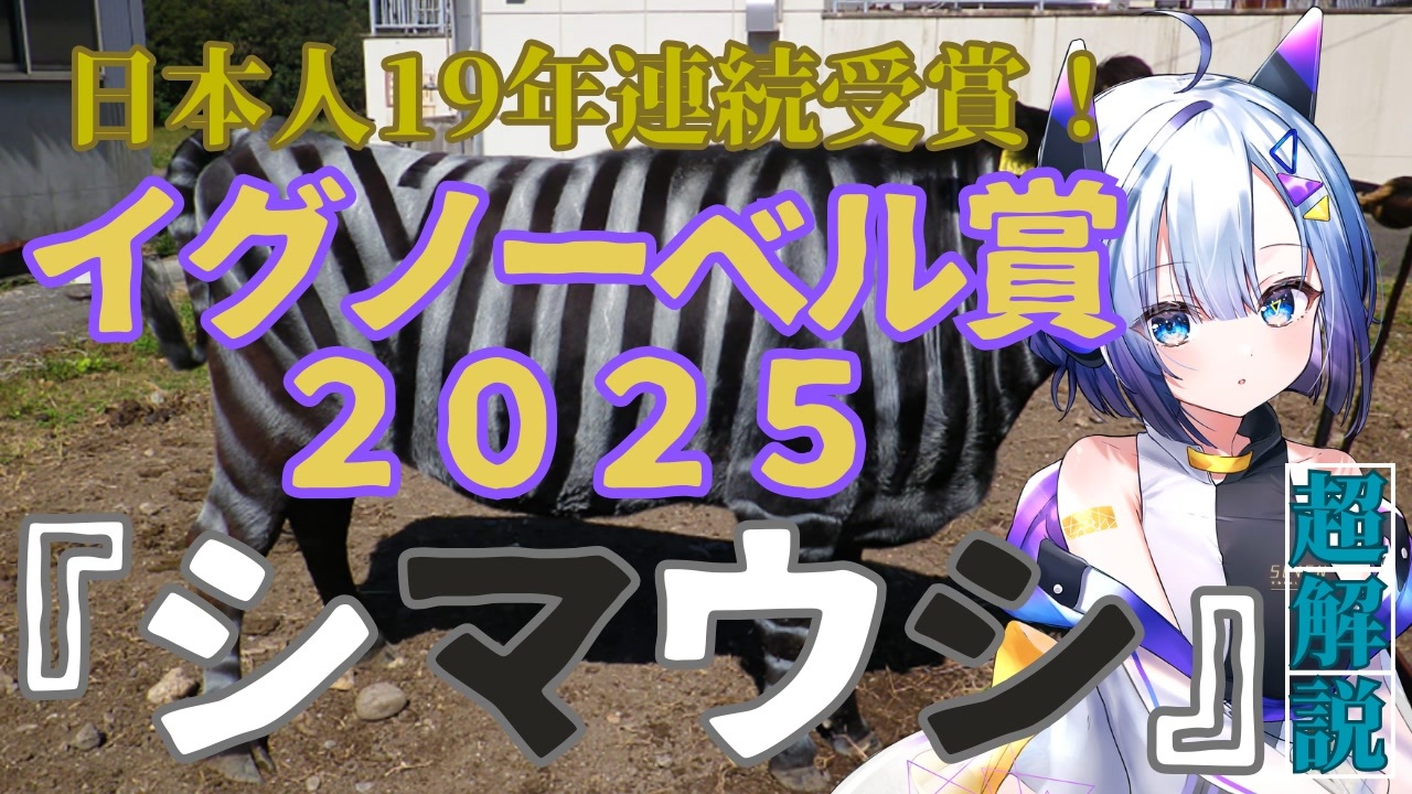 <span style="color: #9900ff; font-size: 24px;"><strong>アカデミアにオレ達の強烈なファクトをストライクだチェケラ!</strong></span><br><br>〈イグノーベル生物学賞(2025)〉<br>「ウシにシマウマのような縞模様を描くとハエに刺されにくくなるのかを調べる実験を行った事に対して」<br>【受賞セレモニー公式youtube配信】<br><a href="https://youtu.be/z1cP4xKd_L4?si=b8QWGbBQcWn17vkc" target="_blank" rel="noopener nofollow">https://youtu.be/z1cP4xKd_L4?si=b8QWGbBQcWn17vkc</a><br><br>『原著論文』 <br>"Cows painted with zebra-like striping can avoid biting fly attack"<br>(シマウマのような縞模様を体に描かれた牛は、刺咬性ハエの攻撃を回避できる)<br><a href="https://journals.plos.org/plosone/article?id=10.1371/journal.pone.0223447" target="_blank" rel="noopener nofollow">https://journals.plos.org/plosone/article?id=10.1371/journal.pone.0223447</a><br><br>『クレジット』<br>キャラクター:No.7(VOICEBOX)<br>BGM:<a href="https://youtu.be/fItf7LyPelc?si=43igSdwXyKvAynp8" target="_blank" rel="noopener nofollow">https://youtu.be/fItf7LyPelc?si=43igSdwXyKvAynp8</a>
