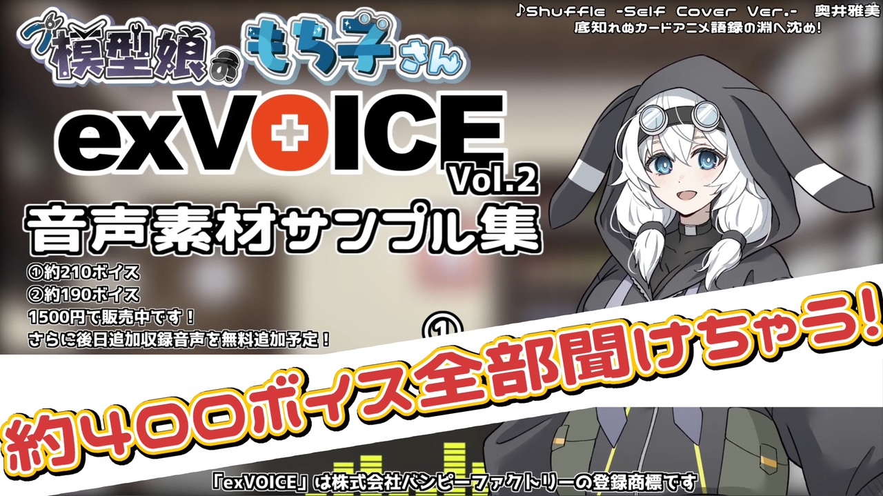 <span style="color: #ff0000; font-size: 24px;">【exVOICE】 #模型娘のもち子さん Vol.2【音声素材集】発売中!!!<br><a href="https://mochizoram.booth.pm/items/7446184" target="_blank" rel="noopener nofollow">https://mochizoram.booth.pm/items/7446184</a></span><br><br>リクエストのあったセリフを多数収録し、WhiteCUL、双葉湊音、雨晴はうへのボイスも特別収録!<br>もち公の鳴き声の2パターンずつ収録あるので、動画使用で役に立つ……かも!<br>台詞一覧は上記商品ページより無料で確認することも可能です<br>ぜひ気に入った台詞があったら、購入して実際に動画で使ってみてください!<br><br />ガンプラ動画まとめ<br>→ <a href="https://www.nicovideo.jp/mylist/62878566" target="_blank" rel="noopener">mylist/62878566</a><br>○公式Twitter<br>運営 <a href="https://twitter.com/V_Mochizora" target="_blank" rel="noopener nofollow">https://twitter.com/V_Mochizora</a><br>もち子 <a href="https://twitter.com/V_Mochiko" target="_blank" rel="noopener nofollow">https://twitter.com/V_Mochiko</a><br>○公式Youtube<br><a href="https://www.youtube.com/channel/UCbF5xOeqwFJuiV5YIBohqtw" target="_blank" rel="noopener nofollow">https://www.youtube.com/channel/UCbF5xOeqwFJuiV5YIBohqtw</a>