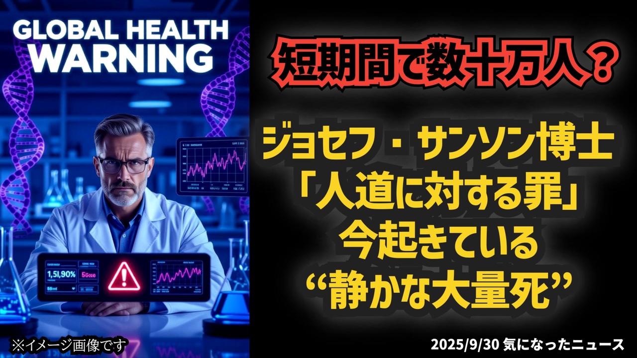 ◆短期間で数十万人の死者?ジョセフ・サンソン博士が警告「人道に反する犯罪」今起きている“静かな大量死”<br><br>ジョセフ・サンソン博士は、新型コロナワクチンが人類の遺伝子に潜在的な脅威を与え、短期死亡や慢性疾患、自己免疫疾患、神経疾患などの健康被害をもたらしていると警告します。日本や米国の超過死亡データ、保険統計を基に分析された数字は無視できない規模です。政治や行政の対応の遅れを指摘し、現状を直視する重要性を訴える、統計と事実に基づく最新レポートです。<br><br>◆今回の台本(詳細)<a href="https://keiichiro8140.hatenablog.com/entry/25092999333" target="_blank" rel="noopener nofollow">https://keiichiro8140.hatenablog.com/entry/25092999333</a><br><br>◆YouTubeチャンネル登録よろしくお願いします🙏 <a href="https://www.youtube.com/@K16news888" target="_blank" rel="noopener nofollow">https://www.youtube.com/@K16news888</a><br><br>◆もしも(BAN)の時のためのマイリンク集<a href="https://lit.link/K16_888" target="_blank" rel="noopener nofollow">https://lit.link/K16_888</a><br><br>ご覧いただきありがとうございます<br>m(_ _)m<br>気になったニュース 2025/9/30<br><br />著作権、肖像権に配慮して作成しております。<br><br>◆気になったニュースの台本!?<br>メモ代わりに作った台本をそのままあげてます<br><a href="https://keiichiro8140.hatenablog.com/." target="_blank" rel="noopener nofollow">https://keiichiro8140.hatenablog.com/.</a><br><br><br>ここからはシリーズ紹介<br><br><br>◆ ワクチン解毒・デトックス<br><a href="https://x.gd/fZweg" target="_blank" rel="noopener nofollow">https://x.gd/fZweg</a><br><br>◆ウイリアム・マキス博士のがん治療(イベルメクチン・フェンベンダゾール等)<br><a href="https://x.gd/AtFYS" target="_blank" rel="noopener nofollow">https://x.gd/AtFYS</a><br><br>◆予防接種健康被害救済制度<br><a href="https://x.gd/0xK9x" target="_blank" rel="noopener nofollow">https://x.gd/0xK9x</a><br><br>◆気になったニュース #1501~<br><br>◆ 【ショートver】気になったニュース<br><a href="https://x.gd/7MxXC" target="_blank" rel="noopener nofollow">https://x.gd/7MxXC</a><br><br>◆ 気になったニュース #1001~<br><a href="https://x.gd/Lp8gv" target="_blank" rel="noopener nofollow">https://x.gd/Lp8gv</a><br><br>◆ 気になったニュース #501~<br><a href="https://x.gd/EmbS4" target="_blank" rel="noopener nofollow">https://x.gd/EmbS4</a><br><br>◆ 気になったニュース #1~#500<br><a href="https://x.gd/uPhNb" target="_blank" rel="noopener nofollow">https://x.gd/uPhNb</a><br><br>◆ X(旧Twitter)・テレグラムで気になった情報<br><a href="https://x.gd/YG6FT" target="_blank" rel="noopener nofollow">https://x.gd/YG6FT</a><br><br>◆ 日比谷5万人パレードデ⚪生放送アーカイブ動画<br><a href="https://x.gd/3CHJv" target="_blank" rel="noopener nofollow">https://x.gd/3CHJv</a><br><br>◆日比谷5万人パレード⚪モのマイリスト作ってみました<br><a href="https://nico.ms/mylist/76828848?ref=sp_other" target="_blank" rel="noopener nofollow">https://nico.ms/mylist/76828848?ref=sp_other</a><br><br>◆3.30 令和の百姓⚪⚪<br><a href="https://www.nicovideo.jp/series/511791?ref=garage_share_other" target="_blank" rel="noopener nofollow">https://www.nicovideo.jp/series/511791?ref=garage_share_other</a><br><br>◆ 及川幸久さんの【XNEWS】シリーズ<br><a href="https://x.gd/3k78K" target="_blank" rel="noopener nofollow">https://x.gd/3k78K</a><br><br>◆これまでの動画<a href="https://x.gd/sPXoJ" target="_blank" rel="noopener nofollow">https://x.gd/sPXoJ</a><br><br>◆もしも(BAN)の時のためのマイリンク集<a href="https://lit.link/K-16_News44" target="_blank" rel="noopener nofollow">https://lit.link/K-16_News44</a><br><br>