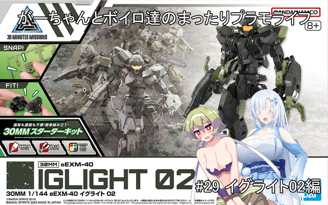 最近新作30MM本体は1か月経っても買いやすい<br><br>使用キット:30MM イグライト02<br> エグザビークル ブーストブレイブバイク<br>使用ソフト:VOICEVOX WhiteCUL、中部つるぎ<br> CyberLink PowerDirector 15 (64 ビット)<br>立ち絵:moiky、九重みすい<br>BGM素材:<a href="https://dova-s.jp/bgm/play16729.html" target="_blank" rel="noopener nofollow">https://dova-s.jp/bgm/play16729.html</a> 他<br><br>同シリーズ動画集<br><a href="https://www.youtube.com/playlist?list=PLrM0AIKXxu1nGqJnbFbbzSbRRDiisv69-" target="_blank" rel="noopener nofollow">https://www.youtube.com/playlist?list=PLrM0AIKXxu1nGqJnbFbbzSbRRDiisv69-</a><br><a href="https://www.upload.nicovideo.jp/niconico-garage/video/series/450827" target="_blank" rel="noopener nofollow">https://www.upload.nicovideo.jp/niconico-garage/video/series/450827</a><br><br>2023プラモ動画集<br><a href="https://www.youtube.com/playlist?list=PLrM0AIKXxu1mDxWQNUDHHKXzIUc3EYCA7" target="_blank" rel="noopener nofollow">https://www.youtube.com/playlist?list=PLrM0AIKXxu1mDxWQNUDHHKXzIUc3EYCA7</a><br><a href="https://www.upload.nicovideo.jp/nv-garage/series/403183" target="_blank" rel="noopener nofollow">https://www.upload.nicovideo.jp/nv-garage/series/403183</a><br><br>★チャンネル登録はコチラ<br><a href="https://www.youtube.com/channel/UCBWGO2PBoA2iJH8K9Kwd-Nw" target="_blank" rel="noopener nofollow">https://www.youtube.com/channel/UCBWGO2PBoA2iJH8K9Kwd-Nw</a><br><br>★最新情報と雑談はXで!<br><a href="https://twitter.com/gatyan5Vtuber1" target="_blank" rel="noopener nofollow">https://twitter.com/gatyan5Vtuber1</a><br><br>★キット紹介ページ<br><a href="https://bandai-hobby.net/item/01_5972/" target="_blank" rel="noopener nofollow">https://bandai-hobby.net/item/01_5972/</a>