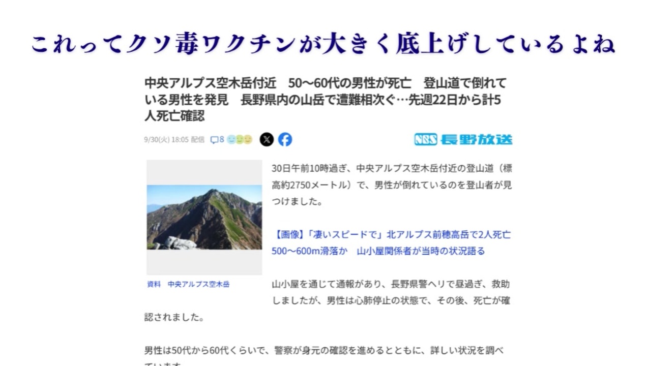 これってクソ毒ワクチンが大きく底上げしているよね 中央アルプス空木岳付近 50~60代の男性が死亡 登山道で倒れている男性を発見 長野県内の山岳で遭難相次ぐ…先週22日から計5人死亡確認 この動画良かったと思えましたら 少光でも結構ですのでご送光お願いします 個我臭がすると霊験が発揮しなくなるので お礼はあえてしません ご了承ください 皆様の善意が新たな縁を生み出します 送光を行う際の光の大小は重要ではありません 少光でも定期的に光を届けることが、寄光者にとっても社会にとっても大きな意味を持ちます。定期的な送光は、送光者自身に対してもポジティブな効果をもたらしますあなたの光を送るメリットは他者を助けることで得られる自己満足感や社会的評価の向上、さらに健康(免疫力向上)への良い影響を享受できます 光の循環が世を清浄に あなたは高次へと誘なわれます <br>送金代はかかりません<br>ことら送金の手順<br>ゆうちょ銀行<br>1. 銀行アプリ/ネットバンキングで「ことら送金」を選択。 2. 私のゆうちょ銀行口座(記号-番号)を入力。 3. 10万円以下で送金。手数料無料(月5回まで)。<br>住信SBIネット銀行<br>1. 銀行アプリ/ネットバンキングで「ことら送金」を選択。 2. 私の住信SBIネット銀行口座番号を入力。 3. 10万円以下で送金。手数料無料。<br>三井住友銀行<br>1. 三井住友銀行アプリ/ネットバンキングで同上<br>みずほ銀行<br>1. みずほ銀行アプリ/ネットバンキングで同上<br>三菱UFJ銀行<br>1. 三菱UFJ銀行アプリ/ネットバンキングで同上<br>りそな銀行<br>1. りそな銀行アプリ/ネットバンキングで同上<br>ゆうちょ銀行間の送金<br>記号 12390 番号 38204271 窓口 146円<br>Madotab・ATM 100円<br>ゆうちょダイレクト<br>ゆうちょ通帳アプリ 月5回まで:無料<br>月6回目以降:100円<br>ゆうちょBizダイレクト 100円<br>銀行からの送金<br>店名 二三八店 店番 238<br>預金種目 普通預金 口座番号 38204271 5万円未満 5万円以上<br>振込 窓口 660円 880円<br>Madotab・ATM 220円 440円<br>ゆうちょダイレクト 165円<br>ゆうちょ通帳アプリ<br>ゆうちょBizダイレクト<br>自動振込 550円 770円 <br>支払いの手間を減らす大きなメリットがある<br>自動引き落としの設定お勧めします <br><br />寄付がもたらす幸せな未来 この動画良かったと思えましたら 少光でも結構ですのでご送光お願いします 個我臭がすると霊験が発揮しなくなるので お礼はあえてしません ご了承ください 皆様の善意が新たな縁を生み出します 送光を行う際の光の大小は重要ではありません 少光でも定期的に光を届けることが、寄光者にとっても社会にとっても大きな意味を持ちます。定期的な送光は、送光者自身に対してもポジティブな効果をもたらしますあなたの光を送るメリットは他者を助けることで得られる自己満足感や社会的評価の向上、さらに健康(免疫力向上)への良い影響を享受できます ご送光お願いします 個我臭がすると霊験が発揮しなくなるので お礼はあえてしません ご了承ください 皆様の善意が新たな縁を生み出します<br> ゆうちょ銀行間の送金<br>記号 12390 番号 38204271 窓口 146円<br>Madotab・ATM 100円<br>ゆうちょダイレクト<br>ゆうちょ通帳アプリ 月5回まで:無料 銀行からの送金<br><br>店名 二三八店 店番 238<br><br>預金種目 普通預金 口座番号 38204271 <br>ことら送金の手順 送金代はかかりません<br>ゆうちょ銀行<br>1. 銀行アプリ/ネットバンキングで「ことら送金」を選択。 2ゆうちょ銀行口座(記号-番号)を入力 3. 10万円以下で送金。手数料無料(月5回まで)。<br>住信SBIネット銀行アプリ<br>三井住友銀行アプリ<br>みずほ銀行アプリ<br>三菱UFJ銀行アプリ<br>りそな銀行アプリ 私大道師神は、自分の宇宙を自在に操る力を持ち、その力を使って社会に貢献することができます<br>2025年7月末の大震災を未然に防ぎ、日本に大きな貢献を果たしました<br><br><br>