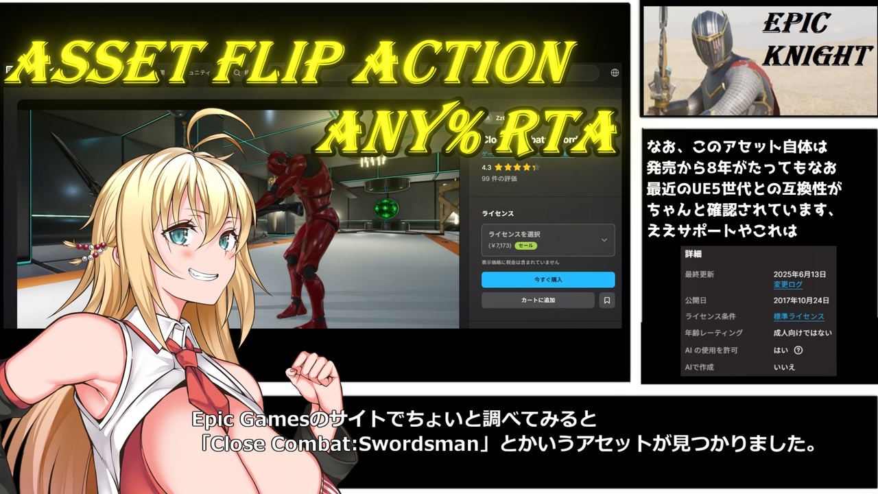<span style="font-size: 18px;">【追記:2025/10/13】</span><br><strong>追走者が2人も現れました</strong><br>俺Epic Knightに…俺Epic Knightだった…(絶望)<br>こっち側は調査が足りなさ過ぎてこれではいけませんね<br>皆も追走者の方々をモニターに穴が開くほど見てホラ<br><br>智琉乃姉貴兄貴 04:29.23 → <a href="https://www.nicovideo.jp/watch/sm45478844" class="watch">sm45478844</a><br>ゆっくりDY兄貴姉貴(敵全撃破)33:41.80 → <a href="https://www.nicovideo.jp/watch/sm45507372" class="watch">sm45507372</a><br><br><span style="font-size: 10px;">(↓以下、投稿時の文書↓)</span><br>(駄菓子ゲーRTAは4年弱ぶりに)初投稿です。<br>・走ることに意義があるって、それ一番言われてるから<br>・どんぴこ闘技場送りの刑を勤めあげてまいりました<br>・見た目に惑わされないで、ゲームの感触は自分でやってみてこそよ<br><br>←前回のRTA(うんこ(Monkey vs Dino)):<a href="https://www.nicovideo.jp/watch/sm39641770" class="watch">sm39641770</a><br>→次回のRTA():ないよ<br><br><レギュレーション><br>・ゲームスタートから全ステージクリアまでのタイムを競う<br>・計測開始地点は暗転画面からStage1ゲーム画面が表示された瞬間(タイトル画面がないため)<br>・計測終了地点はクリアステージ(姫がなんか腹立つダンスしてるとこ)に遷移した瞬間<br>RTAは<a href="#" class="seekTime" data-seekTime="11:26" onclick="seekNicoPlayer('#11:26'); return false;">#11:26</a> くらいから<br><br>◆無編集版はつべにアップロード済み:<a href="https://youtu.be/cIwe9ov2gYo" target="_blank" rel="noopener nofollow">https://youtu.be/cIwe9ov2gYo</a><br><br>◆本ゲームのご購入は→から:<a href="https://store.steampowered.com/app/1872160/EPIC_KNIGHT/" target="_blank" rel="noopener nofollow">https://store.steampowered.com/app/1872160/EPIC_KNIGHT/</a><br><br>◆本ゲームが使用したと思しき素材の一部:<br>・<a href="https://www.fab.com/ja/listings/3017a690-891f-43c6-ab76-3ca5752802b0" target="_blank" rel="noopener nofollow">https://www.fab.com/ja/listings/3017a690-891f-43c6-ab76-3ca5752802b0</a><br>・<a href="https://www.youtube.com/watch?v=RgGyuO5Fxq0" target="_blank" rel="noopener nofollow">https://www.youtube.com/watch?v=RgGyuO5Fxq0</a><br>・<a href="https://www.youtube.com/watch?v=UnHdix4ISes" target="_blank" rel="noopener nofollow">https://www.youtube.com/watch?v=UnHdix4ISes</a><br><br>◆以前作ったSteam駄菓子ゲーグループ(廃墟) :<a href="https://steamcommunity.com/groups/dagashi_100yen" target="_blank" rel="noopener nofollow">https://steamcommunity.com/groups/dagashi_100yen</a><br><br>◆合成音声クレジット<br>・VOICEROID+民安ともえ EX<br>・VOICEPEAK 小春六花<br>・A.I.VOICE 伊織 弓鶴<br>・VOICEVOX WhiteCUL(スタイル:びえーん)