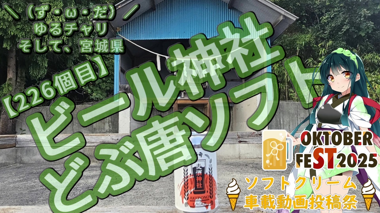 ずんだを食べたりしながら宮城県をゆるチャリするだけです<br>ビール神社に行ったり、どぶ唐ソフトを食べたり<br>「STオクトーバーフェスト2025」と「ソフトクリーム車載動画投稿祭」への参加動画となります。<br><br>2025年09月28日(日)<br>■道の駅 上品の郷<br><a href="https://joubon.com/" target="_blank" rel="noopener nofollow">https://joubon.com/</a><br>■石巻市震災遺構 大川小学校<br><a href="https://www.ishinomakiikou.net/okawa/" target="_blank" rel="noopener nofollow">https://www.ishinomakiikou.net/okawa/</a><br>■釣石神社<br><a href="https://1380.jp/" target="_blank" rel="noopener nofollow">https://1380.jp/</a><br>■から揚げ こっこ屋<br><a href="https://www.instagram.com/karaage_coccoya/" target="_blank" rel="noopener nofollow">https://www.instagram.com/karaage_coccoya/</a><br>■北上観光物産交流センター<br><a href="https://kitakamicenter.com/" target="_blank" rel="noopener nofollow">https://kitakamicenter.com/</a><br>■ビール神社(鹿嶋神社)<br><a href="https://yaokami.jp/1040166/" target="_blank" rel="noopener nofollow">https://yaokami.jp/1040166/</a><br>■「ビール神社」復興プロジェクト<br><a href="https://camp-fire.jp/projects/831320/view" target="_blank" rel="noopener nofollow">https://camp-fire.jp/projects/831320/view</a><br>■一品堂<br><a href="https://www.tagakan.jp/eat/detail.html?content=109" target="_blank" rel="noopener nofollow">https://www.tagakan.jp/eat/detail.html?content=109</a><br><br>AI音声・文章・音楽・画像生成利用<br><br><a target="_blank" href="https://qa.nicovideo.jp/faq/show/19424?site_domain=default" style="font-size: 13px;color: #657586; text-decoration: underline; line-height: 1.4">この動画は投稿者によって修正されました</a>
