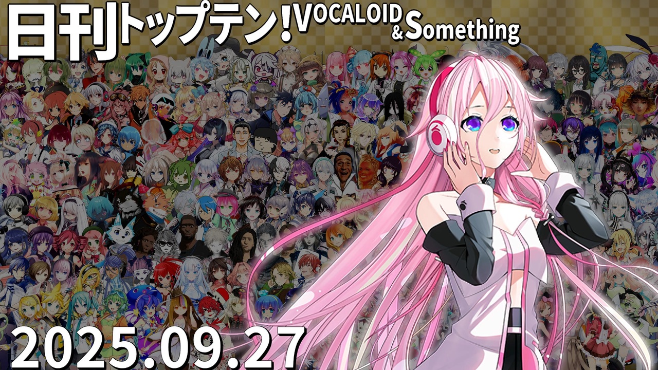 前日(9/26)←<a href="https://www.nicovideo.jp/watch/sm45462061" class="watch">sm45462061</a> <a href="https://www.nicovideo.jp/watch/sm45471998" class="watch">sm45471998</a>→翌日(9/28)<br>★Mixi2にもいます。<a href="https://mixi.social/@LUKANAN_P" target="_blank" rel="noopener nofollow">https://mixi.social/@LUKANAN_P</a><br><br>★チャプター<br>昨日1位<a href="#" class="seekTime" data-seekTime="0:00" onclick="seekNicoPlayer('#0:00'); return false;">#0:00</a> TOP10<a href="#" class="seekTime" data-seekTime="0:36" onclick="seekNicoPlayer('#0:36'); return false;">#0:36</a> 1年前<a href="#" class="seekTime" data-seekTime="2:56" onclick="seekNicoPlayer('#2:56'); return false;">#2:56</a> TOP3<a href="#" class="seekTime" data-seekTime="3:24" onclick="seekNicoPlayer('#3:24'); return false;">#3:24</a> 10年前<a href="#" class="seekTime" data-seekTime="4:55" onclick="seekNicoPlayer('#4:55'); return false;">#4:55</a> PICKUP<a href="#" class="seekTime" data-seekTime="5:23" onclick="seekNicoPlayer('#5:23'); return false;">#5:23</a> <br><br>★トップテン<br>10:<a href="https://www.nicovideo.jp/watch/sm45419726" class="watch">sm45419726</a> 9:<a href="https://www.nicovideo.jp/watch/sm45430522" class="watch">sm45430522</a> 8:<a href="https://www.nicovideo.jp/watch/sm45444638" class="watch">sm45444638</a> 7:<a href="https://www.nicovideo.jp/watch/sm45403441" class="watch">sm45403441</a> <br>6:<a href="https://www.nicovideo.jp/watch/sm45431038" class="watch">sm45431038</a> 5:<a href="https://www.nicovideo.jp/watch/sm45447239" class="watch">sm45447239</a> 4:<a href="https://www.nicovideo.jp/watch/sm45442576" class="watch">sm45442576</a> 3:<a href="https://www.nicovideo.jp/watch/sm45441791" class="watch">sm45441791</a> 2:<a href="https://www.nicovideo.jp/watch/sm45446774" class="watch">sm45446774</a> 1:<a href="https://www.nicovideo.jp/watch/sm45430185" class="watch">sm45430185</a> <br><br>★ピックアップ(B~Dは超新着枠)<br>B:<a href="https://www.nicovideo.jp/watch/sm45443189" class="watch">sm45443189</a> C:<a href="https://www.nicovideo.jp/watch/sm45435697" class="watch">sm45435697</a> D:<a href="https://www.nicovideo.jp/watch/sm45446329" class="watch">sm45446329</a> E:<a href="https://www.nicovideo.jp/watch/sm45421998" class="watch">sm45421998</a> F:<a href="https://www.nicovideo.jp/watch/sm45424070" class="watch">sm45424070</a> G:<a href="https://www.nicovideo.jp/watch/sm45427794" class="watch">sm45427794</a> <br>H:<a href="https://www.nicovideo.jp/watch/sm45420926" class="watch">sm45420926</a> <br><br>★プレイバック <br>A(1年前):<a href="https://www.nicovideo.jp/watch/sm44147265" class="watch">sm44147265</a> 十(10年前):<a href="https://www.nicovideo.jp/watch/sm27244984" class="watch">sm27244984</a> 前日の第1位: <a href="https://www.nicovideo.jp/watch/sm45415871" class="watch">sm45415871</a>(IA_-ARIA_ON_THE_PLANETES-)<br><br>☆集計対象:2025/9/20~27 5時投稿の作品(9/27 5時集計)<br>★計算式:再生×1+コメント×最大12+いいね!×15+マイリスト×12<br>☆プレイリスト:<u><a href="https://nikkantop10.hatenablog.com/entry/ar20250927" target="_blank" rel="noopener nofollow">https://nikkantop10.hatenablog.com/entry/ar20250927</a></u> 、 <a href="https://www.nicovideo.jp/mylist/49271984" target="_blank" rel="noopener">mylist/49271984</a> <br>★1年前トップテン:<a href="https://www.nicovideo.jp/watch/sm44154477" class="watch">sm44154477</a><br />★日刊トップテン動画一覧マイリスト:<a href="https://www.nicovideo.jp/mylist/47849908" target="_blank" rel="noopener">mylist/47849908</a><br>☆ルールや計算式の詳細:<a href="https://nikkantop10-sub.hatenablog.com/entry/top10_rule" target="_blank" rel="noopener nofollow">https://nikkantop10-sub.hatenablog.com/entry/top10_rule</a><br><span style="color: #262626;">★K!!te Playlist LINK!:<a href="https://kiite.jp/user/AIST_playlist_bot" target="_blank" rel="noopener nofollow">https://kiite.jp/user/AIST_playlist_bot</a><br>☆Twitter:<a href="https://twitter.com/VOCALO_NEWRANK" target="_blank" rel="noopener nofollow">https://twitter.com/VOCALO_NEWRANK</a><br>★Thread:<a href="https://www.threads.net/@lukanan_p" target="_blank" rel="noopener nofollow">https://www.threads.net/@lukanan_p</a></span><br><br><span style="color: #0000ff;"><strong>◆今後の動画投稿イベント情報</strong></span><br>2025/12/29~31 <strong>先端映像音楽表現投稿祭</strong> <a href="https://twipla.jp/events/678401" target="_blank" rel="noopener nofollow">https://twipla.jp/events/678401</a><br>2026/1/1~4 <strong>ボカロサビ投稿祭2026 </strong><a href="https://twipla.jp/events/705936" target="_blank" rel="noopener nofollow">https://twipla.jp/events/705936</a> ※既存曲は新規投稿で参加可<br>2026/1/10~12 <strong>ポストロック投稿祭 </strong><a href="https://twipla.jp/events/694939" target="_blank" rel="noopener nofollow">https://twipla.jp/events/694939</a>