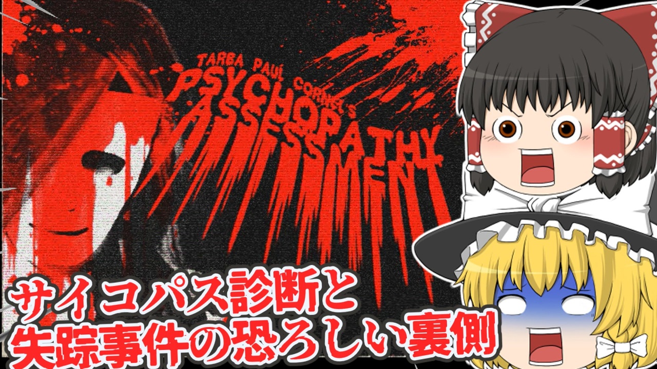 ゆっくり霊夢とゆっくり魔理沙が海外のホラーゲームに挑むようです。<br><br>本動画は東方Projectの二次創作です。 <br><br>◎あらすじ◎<br>サイコパシー・アセスメントは、ゲームと現実の境界線を曖昧にする、80年代のレトロなVHSアナログホラー体験です。<br>あなたはサイコパシー検査を受けることになる。そして、その結果はとても不穏なものだ…<br><br>※投稿者のガバ翻訳付きです。<br>配信ページ <br><a href="https://store.steampowered.com/app/3260910/Psychopathy_Assessment/" target="_blank" rel="noopener nofollow">https://store.steampowered.com/app/3260910/Psychopathy_Assessment/</a><br><br>COEIROINK:おふとんP<br>COEIROINK:AI声優-銀芽<br>COEIROINK:AI声優-金苗<br>COEIROINK:黒聡鵜月<br>COEIROINK:アンジーさん<br>COEIROINK:虚音イフ<br><a href="https://coeiroink.com/" target="_blank" rel="noopener nofollow">https://coeiroink.com/</a><br><br>BGM・効果音をお借りしました。<br><a href="https://otologic.jp/" target="_blank" rel="noopener nofollow">https://otologic.jp/</a><br><br>立ち絵をお借りしました。<br><a href="https://seiga.nicovideo.jp/seiga/im10933652" target="_blank" rel="noopener nofollow">https://seiga.nicovideo.jp/seiga/im10933652</a><br><a href="https://seiga.nicovideo.jp/seiga/im11230837" target="_blank" rel="noopener nofollow">https://seiga.nicovideo.jp/seiga/im11230837</a><br><a href="https://seiga.nicovideo.jp/seiga/im11229020" target="_blank" rel="noopener nofollow">https://seiga.nicovideo.jp/seiga/im11229020</a><br><a href="https://seiga.nicovideo.jp/seiga/im4817713" target="_blank" rel="noopener nofollow">https://seiga.nicovideo.jp/seiga/im4817713</a>