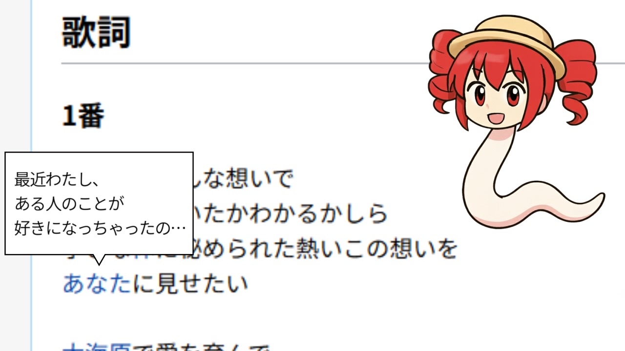 ■動物ソング投稿祭2025に参加します!<br>■【アニサキス】になったテトちゃん、果たして恋は成就するのでしょうか…<br><br>(歌詞)<br><br>わたしがどんな想いで<br>身を潜めていたかわかるかしら<br>小さな体に秘められた熱いこの想いを<br>あなたに見せたい<br><br>大海原で愛を育んで<br>大きくなったよ(ほめてほめて)<br>どうかお願い<br>あなたの中にわたしを入れさせて<br><br>だからKissして! わたしにKissして!<br>でなきゃKissする! わたしがKissする!<br>あなたのピンクの粘膜めがけて飛び込みたいの<br><br>なにさKissして! 逃げずにKissして!<br>やっぱりKissする! 強くKissす・る・から!<br>覚悟しといてね!!<br><br><br>わたしの愛がイタいと<br>あなたは顔をしかめてるけれど<br>命をも賭けたこの愛が成就しない限り<br>わたしは死ねない<br><br>だから必死過ぎて無様でしょうけれど<br>わたしを許して(めんごめんご)<br>ほんの少しだけでいいから<br>ちっちゃな愛 実らせて…!<br><br>だからKissして! わたしにKissして!<br>でなきゃKissする! わたしがKissする!<br>あなたのピンクの粘膜 吸い付いて離さないの<br><br>なにさKissして! なにさKissして!<br>なにさKissして! ぁにさ、Kissしてよぉ…!<br>あ~ やっぱりわたし間違っちゃった!<br>好きになっちゃいけない人、好きになっちゃった!