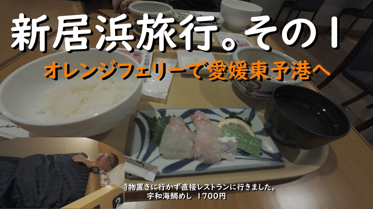 新居浜旅行。<br>新居浜旅行。その1 大阪南港からオレンジフェリーに乗り愛媛県東予港に行きます。 <br>10時出航ですが、8時に乗船出来ます。 <br>鯛めしを食べて早く寝ます。風呂は家で入って来ました。<br> <br>先に上げた動画編集できません。で、カメラをオズモアクションに帰ると4Kで処理が追い付かず 編集出来なかったのです。 <br>しかし視聴者さんのコメントで動画ソフトのプレビュー画面の画質を落とす、書き込み時に高画質に戻すやり方でなんとか上げました。 <br><br>それでも、何度もフリーズするので怖くて編集が荒くてすいません。