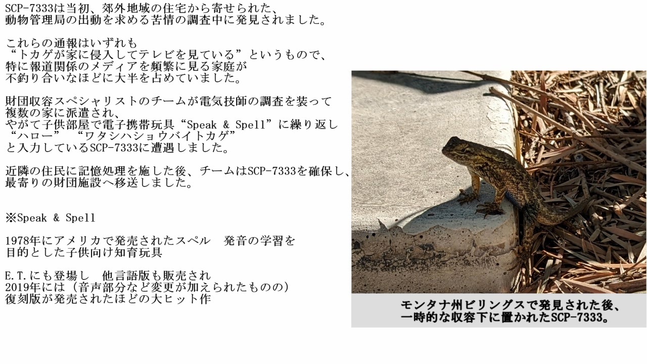 タイトル: SCP-7333 - 商売蜥蜴<br>原語版タイトル: SCP-7333 - Business Lizard<br>訳者: C-Dives<br>原語版作者: Zyn<br>ソース: <a href="http://scp-jp.wikidot.com/scp-7333" target="_blank" rel="noopener nofollow">http://scp-jp.wikidot.com/scp-7333</a><br>原語版ソース: <a href="http://scp-wiki.wikidot.com/scp-7333" target="_blank" rel="noopener nofollow">http://scp-wiki.wikidot.com/scp-7333</a><br>ライセンス: CC BY-SA 3.0<br><br><br>近況:<br><br>ドンキーコング バナンザのバナンザ<br>きっとバナナ+サバンナが由来なんやな!<br>と思ってたら全然違ってた<br><br><br><br><span style="color: #000000; font-size: 14px;"><strong>夜鷹が鳴く頃に 見て欲しいもの入れ(創作物)</strong></span><br><span style="color: #006699; font-size: 14px;"><a href="https://www.nicovideo.jp/mylist/66904506" target="_blank" rel="noopener">mylist/66904506</a></span><br><span style="color: #000000; font-size: 14px;">(SCPシリーズ他まとめ)</span><br><br>youtubeアカウント<br><a href="https://www.youtube.com/@user-yq7os2gt6b" target="_blank" rel="noopener nofollow">https://www.youtube.com/@user-yq7os2gt6b</a><br><br>ウマ娘トレーナーID / 474456856<br><br>X / @MTzLFGalKimIJAZ
