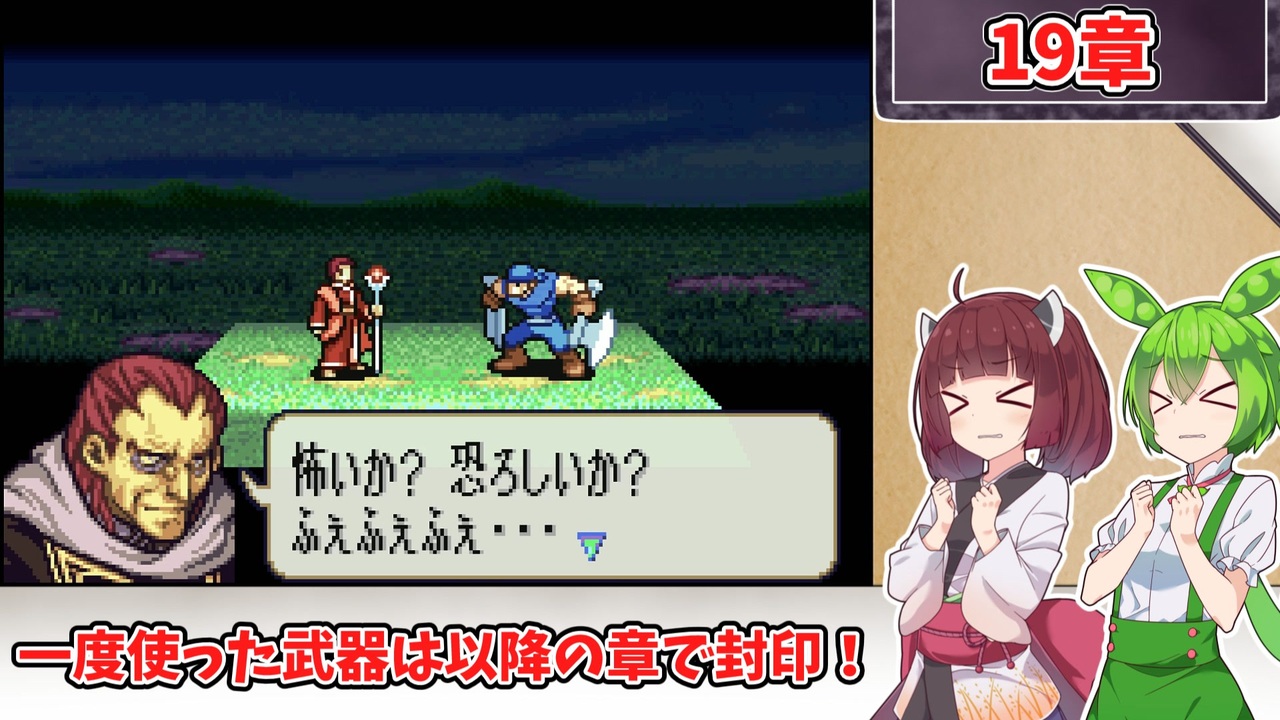 <span style="color: #85200c; font-size: 24px;"><strong><i>久々に動画時間短めですね(当社比)</i></strong></span><br><br><br><br><span style="font-size: 16px;"><strong>1:一度使用した武器種は、以降の章で使用する事を禁止する。<br>2:武器の使用の定義は『その武器を装備した状態で敵との戦闘が発生したタイミング』<br>または『その武器を売却したタイミング』<br>杖の場合は『対象に対して使用した時点(命中の可否は問わない)』とする。 </strong></span><br><span style="color: #ff0000; font-size: 16px;"><strong>※同盟軍、演出による戦闘イベントでは使用した判定にはならないこととする。</strong></span><span style="font-size: 16px;"><strong> <br>3:仲間候補のユニットを全員加入、生存させた状態でゲームをクリアする。<br>4:上級クラスのユニットは「武器を装備した状態」での戦闘を禁止する。<br>5:バグ技禁止</strong></span><br><br>この動画シリーズ【<a href="https://www.nicovideo.jp/series/516459" target="_blank" rel="noopener">series/516459</a>】<br>『トラ7』の同縛りプレイ【<a href="https://www.nicovideo.jp/series/482976" target="_blank" rel="noopener">series/482976</a>】<br>『烈火』の同縛りプレイ【<a href="https://www.nicovideo.jp/series/406473" target="_blank" rel="noopener">series/406473</a>】<br>『封印』の同縛りプレイ【<a href="https://www.nicovideo.jp/series/316824" target="_blank" rel="noopener">series/316824</a>】<br><br>前:【<a href="https://www.nicovideo.jp/watch/sm45450302" class="watch">sm45450302</a>】次:【<a href="https://www.nicovideo.jp/watch/sm45500580" class="watch">sm45500580</a>】<br><br><strong>使用したソフト</strong><br>VOICEROID+東北きりたんEX<br>VOICEVOX:ずんだもん<br>VOICEPEAK:ずんだもん<br>VOICEROID+東北ずん子<br>VOICEROID2 東北イタコ<br><strong>お借りした素材</strong><br>ニコニコモンズの皆様(コンテンツツリー参照)