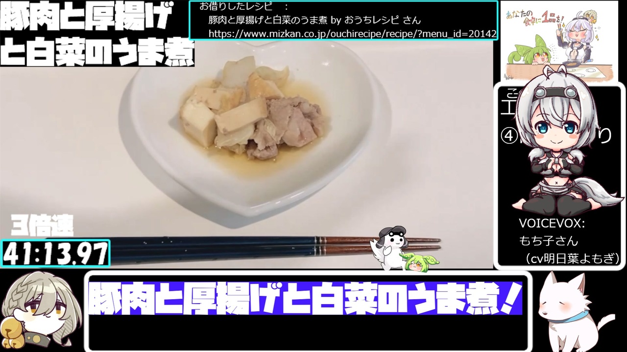 料理初心者がはじめて作る料理にチャレンジします!<br><br>参考にしたレシピはこちら<br> 豚肉と厚揚げと白菜のうま煮 by おうちレシピ さん<br> <a href="https://www.mizkan.co.jp/ouchirecipe/recipe/?menu_id=20142" target="_blank" rel="noopener nofollow">https://www.mizkan.co.jp/ouchirecipe/recipe/?menu_id=20142</a><br><br>本動画は以下の投稿祭に参加しています。<br> 【開催告知】豆腐祭り 一丁目!!【豆腐は、いいぞ。】 by T.N.Chaos さん<br> <a href="https://www.nicovideo.jp/watch/sm44986799" target="_blank" rel="noopener nofollow">https://www.nicovideo.jp/watch/sm44986799</a><br /><br>編集に使用させていただいているものは、プロフィールみてね!<br><a href="https://www.nicovideo.jp/user/311366" target="_blank" rel="noopener nofollow">https://www.nicovideo.jp/user/311366</a><br><br>読み上げ:VOICEVOX もち子(cv明日葉よもぎ)、ずんだもん、四国めたん、青山龍星、WhiteCUL、伊織弓鶴、COEIROINK:猫米茶<br><br><strong>過去の動画にコメント、いいね!、ギフト、広告、フォロー、マイリストありがとうございました!</strong><br><br>とり料理祭ありがとうございました!<br>2023参加作品はこちら ⇒ <a href="https://www.nicovideo.jp/mylist/75430531" target="_blank" rel="noopener nofollow">https://www.nicovideo.jp/mylist/75430531</a><br>2024冬参加作品はこちら ⇒ <a href="https://www.nicovideo.jp/mylist/75862737" target="_blank" rel="noopener nofollow">https://www.nicovideo.jp/mylist/75862737</a><br>2024夏参加作品はこちら ⇒ <a href="https://www.nicovideo.jp/mylist/76572716" target="_blank" rel="noopener nofollow">https://www.nicovideo.jp/mylist/76572716</a><br>2025冬参加作品はこちら ⇒ <a href="https://www.nicovideo.jp/mylist/77171241" target="_blank" rel="noopener nofollow">https://www.nicovideo.jp/mylist/77171241</a><br>2025夏参加作品はこちら ⇒ <a href="https://www.nicovideo.jp/mylist/77600849" target="_blank" rel="noopener nofollow">https://www.nicovideo.jp/mylist/77600849</a><br><br>このその日ごとになんか出す定食屋か駄菓子屋のごとき動画を継続して投稿するために<br>スポンサーをひっそり募集しております、あなたも一口いかが?<br><a href="https://creator-support.nicovideo.jp/registration/311366" target="_blank" rel="noopener nofollow">https://creator-support.nicovideo.jp/registration/311366</a>