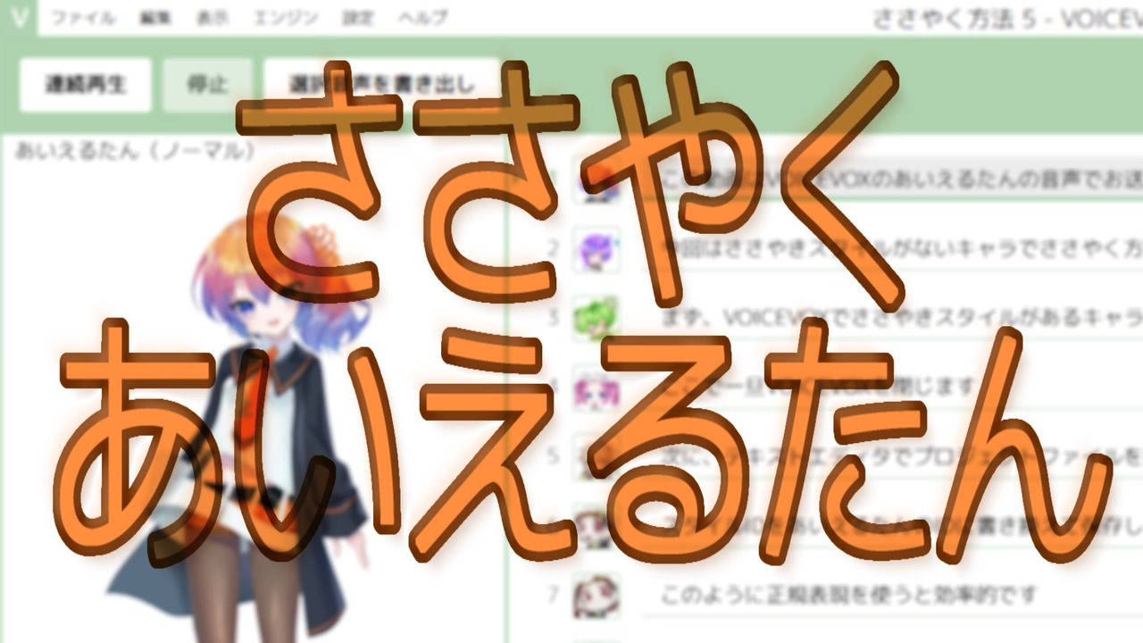 # 要約<br><br>この動画ではVOICEVOXで(ささやき)スタイルがないキャラで囁き声を出す方法を解説しています。<br><br># 具体的な手順<br><br>1. VOICEVOXで(ささやき)スタイルがあるキャラでセリフを作成します。<br>2. VOICEVOXを一旦閉じます。<br>3. プロジェクトファイルをテキストエディタで開きます。<br>4. スタイルIDを書き換えて保存します。<br>5. プロジェクトファイルをVOICEVOXで開きます。<br>6. 音声を出力します。<br>7. クレジットは1.で使用したキャラと6.で使用したキャラの両方を明記します。<br><br># 使用素材<br><br>## 音楽<br><br>音楽:BGMer<br><a href="http://bgmer.net" target="_blank" rel="noopener nofollow">http://bgmer.net</a><br><br>フリーBGM [ソメイヨシノ]<br><a href="https://bgmer.net/music/220" target="_blank" rel="noopener nofollow">https://bgmer.net/music/220</a><br><a href="https://www.youtube.com/watch?v=91xkv3pz9rw" target="_blank" rel="noopener nofollow">https://www.youtube.com/watch?v=91xkv3pz9rw</a><br><br>## 最終出力音声<br><br>VOICEVOX:あいえるたん<br><br>## 中間出力音声(音声クエリ)<br><br>VOICEVOX:九州そら<br>VOICEVOX:四国めたん<br><br>VOICEVOX:ずんだもん<br><a href="https://www.nicovideo.jp/watch/sm33517192" target="_blank" rel="noopener nofollow">https://www.nicovideo.jp/watch/sm33517192</a><br><br>VOICEVOX:春日部つむぎ<br><a href="https://www.nicovideo.jp/watch/sm39656626" target="_blank" rel="noopener nofollow">https://www.nicovideo.jp/watch/sm39656626</a><br><br>VOICEVOX:満別花丸<br><a href="https://www.nicovideo.jp/watch/sm42837410" target="_blank" rel="noopener nofollow">https://www.nicovideo.jp/watch/sm42837410</a><br><br>VOICEVOX:ナースロボ_タイプT<br><a href="https://www.nicovideo.jp/watch/sm41559811" target="_blank" rel="noopener nofollow">https://www.nicovideo.jp/watch/sm41559811</a><br><br>VOICEVOX:青山龍星<br><a href="https://commons.nicovideo.jp/works/nc247844" target="_blank" rel="noopener nofollow">https://commons.nicovideo.jp/works/nc247844</a><br>