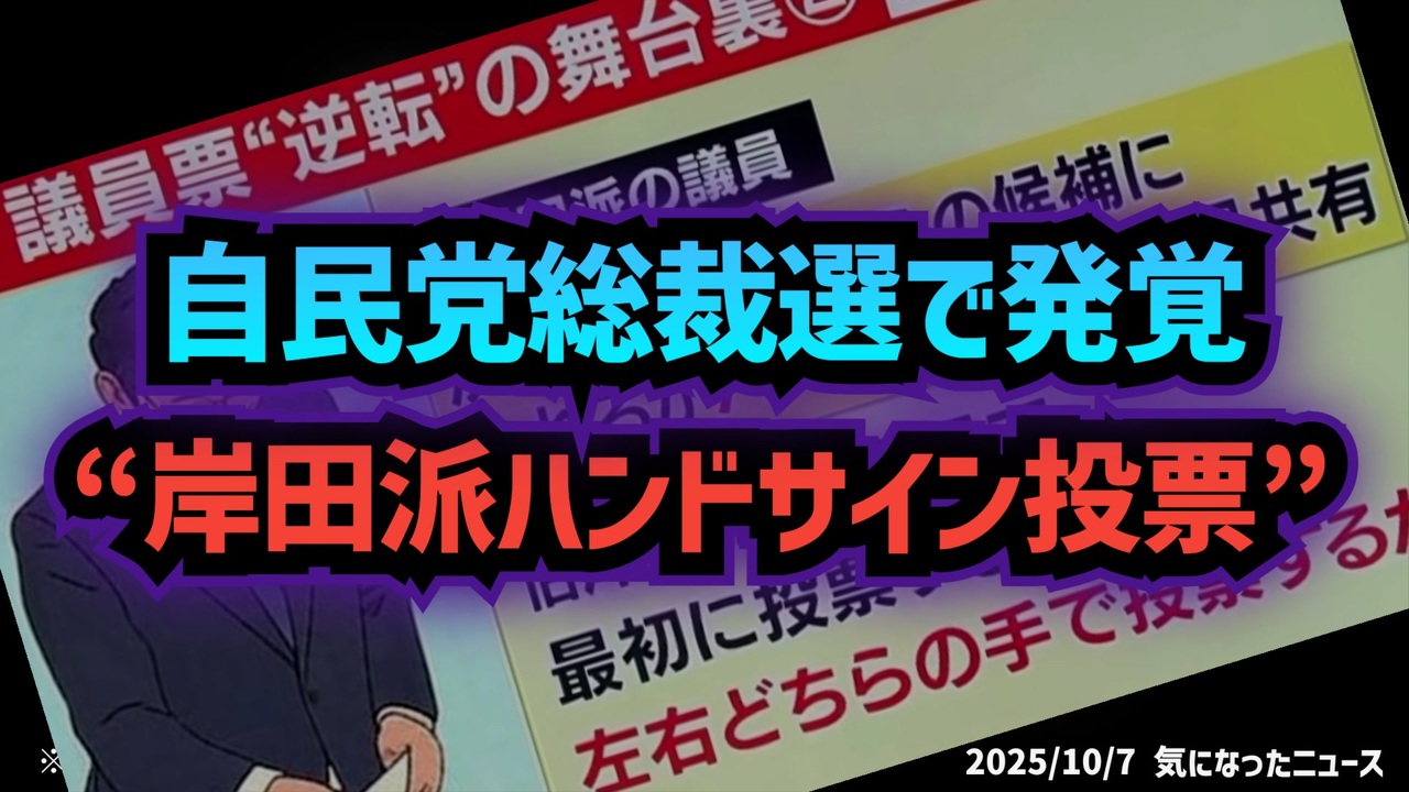 【自民党総裁選で組織票!?】◆岸田派ハンドサインで投票発覚 メディアが報じる<br><br>ハンドサインで投票?<br><br>あらすじ<br>かつて政権を守ってきたメディアが、いまやその裏側を暴き始めています。<br> 報じられたのは、旧岸田派が決選投票の際、右手か左手かで投票先を示し合っていたという“ハンドサイン選挙”の実態。<br> 派閥解消を掲げながら、裏では派閥の力で動くという二重構造。<br> 結果、流れを変えたのは岸田派の一部離脱。<br> そして高市早苗氏が新総裁に就任。<br> メディアが沈黙を破り、政権の裏の動きを報じるようになった今、<br> 政治の抑止力としての「報道の本来の姿」が問われています。<br><br>◆今回の台本(詳細)<a href="https://keiichiro8140.hatenablog.com/entry/25100777111" target="_blank" rel="noopener nofollow">https://keiichiro8140.hatenablog.com/entry/25100777111</a><br><br>◆もしも(BAN)の時のためのマイリンク集<a href="https://lit.link/K16_888" target="_blank" rel="noopener nofollow">https://lit.link/K16_888</a><br><br>◆YouTubeチャンネル登録よろしくお願いします🙏 <a href="https://www.youtube.com/@K16news888" target="_blank" rel="noopener nofollow">https://www.youtube.com/@K16news888</a><br><br>ご覧いただきありがとうございます<br>m(_ _)m<br>気になったニュース 2025/10/07<br><br />著作権、肖像権に配慮して作成しております。<br><br>◆気になったニュースの台本!?<br>メモ代わりに作った台本をそのままあげてます<br><a href="https://keiichiro8140.hatenablog.com/." target="_blank" rel="noopener nofollow">https://keiichiro8140.hatenablog.com/.</a><br><br><br>ここからはシリーズ紹介<br><br><br>◆ ワクチン解毒・デトックス<br><a href="https://x.gd/fZweg" target="_blank" rel="noopener nofollow">https://x.gd/fZweg</a><br><br>◆ウイリアム・マキス博士のがん治療(イベルメクチン・フェンベンダゾール等)<br><a href="https://x.gd/AtFYS" target="_blank" rel="noopener nofollow">https://x.gd/AtFYS</a><br><br>◆予防接種健康被害救済制度<br><a href="https://x.gd/0xK9x" target="_blank" rel="noopener nofollow">https://x.gd/0xK9x</a><br><br>◆気になったニュース #1501~<br><br>◆ 【ショートver】気になったニュース<br><a href="https://x.gd/7MxXC" target="_blank" rel="noopener nofollow">https://x.gd/7MxXC</a><br><br>◆ 気になったニュース #1001~<br><a href="https://x.gd/Lp8gv" target="_blank" rel="noopener nofollow">https://x.gd/Lp8gv</a><br><br>◆ 気になったニュース #501~<br><a href="https://x.gd/EmbS4" target="_blank" rel="noopener nofollow">https://x.gd/EmbS4</a><br><br>◆ 気になったニュース #1~#500<br><a href="https://x.gd/uPhNb" target="_blank" rel="noopener nofollow">https://x.gd/uPhNb</a><br><br>◆ X(旧Twitter)・テレグラムで気になった情報<br><a href="https://x.gd/YG6FT" target="_blank" rel="noopener nofollow">https://x.gd/YG6FT</a><br><br>◆ 日比谷5万人パレードデ⚪生放送アーカイブ動画<br><a href="https://x.gd/3CHJv" target="_blank" rel="noopener nofollow">https://x.gd/3CHJv</a><br><br>◆日比谷5万人パレード⚪モのマイリスト作ってみました<br><a href="https://nico.ms/mylist/76828848?ref=sp_other" target="_blank" rel="noopener nofollow">https://nico.ms/mylist/76828848?ref=sp_other</a><br><br>◆3.30 令和の百姓⚪⚪<br><a href="https://www.nicovideo.jp/series/511791?ref=garage_share_other" target="_blank" rel="noopener nofollow">https://www.nicovideo.jp/series/511791?ref=garage_share_other</a><br><br>◆ 及川幸久さんの【XNEWS】シリーズ<br><a href="https://x.gd/3k78K" target="_blank" rel="noopener nofollow">https://x.gd/3k78K</a><br><br>◆これまでの動画<a href="https://x.gd/sPXoJ" target="_blank" rel="noopener nofollow">https://x.gd/sPXoJ</a><br><br>◆もしも(BAN)の時のためのマイリンク集<a href="https://lit.link/K-16_News44" target="_blank" rel="noopener nofollow">https://lit.link/K-16_News44</a><br><br>