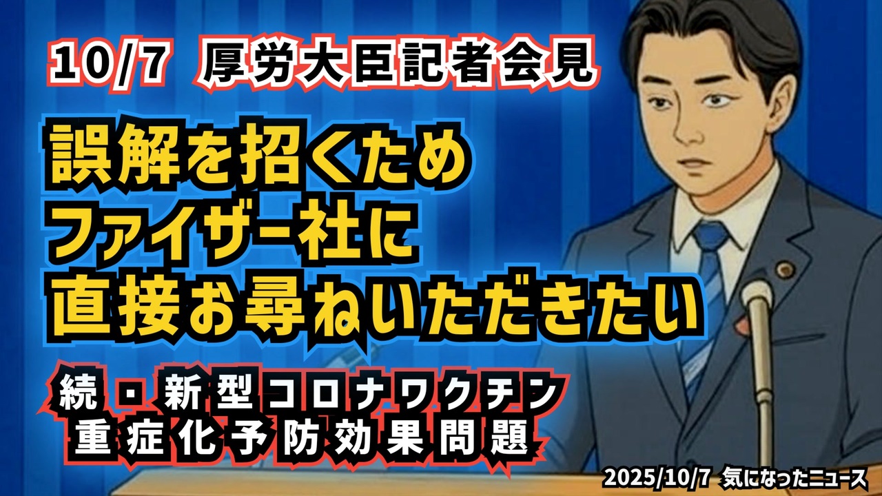 【続】◆厚労省とファイザー、重症化予防の見解は一致せず ~ ファイザーワクチン『重症化予防効 果、見解なし』と記者報告【10月7日 厚生労働大臣会見】<br><br>あらすじ<br>記者がファイザー社に確認したところ「重症化予防効果についての見解はない」と回答した。一方で福岡厚労大臣は、2021年の審議会で重症化予防に関する論文が報告され、その論文に「ファイザー社へ結果を報告した」と記載されていることから「同社も認識している」と説明した。だが大臣は同社の正式な受け止め方については「直接問い合わせてほしい」と繰り返し、政府はメーカーの公式見解を明確に示していない。何千億円もの調達を行った公的責任の観点から、国民に不可欠な「効果の公的確認」と「説明責任」が問われる事態だ。<a href="https://x.gd/8Nl7V" target="_blank" rel="noopener nofollow">https://x.gd/8Nl7V</a><br><br>藤江さん<a href="https://x.com/JINKOUZOUKA_jp/status/1975495562649838010?t=4eFC5xSGApuea-hIkvlGmA&s=19" target="_blank" rel="noopener nofollow">https://x.com/JINKOUZOUKA_jp/status/1975495562649838010?t=4eFC5xSGApuea-hIkvlGmA&s=19</a><br><br>◆今回の台本(詳細)<a href="https://keiichiro8140.hatenablog.com/entry/25100777333999" target="_blank" rel="noopener nofollow">https://keiichiro8140.hatenablog.com/entry/25100777333999</a><br><br>◆もしも(BAN)の時のためのマイリンク集<a href="https://lit.link/K16_888" target="_blank" rel="noopener nofollow">https://lit.link/K16_888</a><br><br>◆YouTubeチャンネル登録よろしくお願いします🙏 <a href="https://www.youtube.com/@K16news888" target="_blank" rel="noopener nofollow">https://www.youtube.com/@K16news888</a><br><br>ご覧いただきありがとうございます<br>m(_ _)m<br>気になったニュース 2025/10/07<br><br />著作権、肖像権に配慮して作成しております。<br><br>◆気になったニュースの台本!?<br>メモ代わりに作った台本をそのままあげてます<br><a href="https://keiichiro8140.hatenablog.com/." target="_blank" rel="noopener nofollow">https://keiichiro8140.hatenablog.com/.</a><br><br><br>ここからはシリーズ紹介<br><br><br>◆ ワクチン解毒・デトックス<br><a href="https://x.gd/fZweg" target="_blank" rel="noopener nofollow">https://x.gd/fZweg</a><br><br>◆ウイリアム・マキス博士のがん治療(イベルメクチン・フェンベンダゾール等)<br><a href="https://x.gd/AtFYS" target="_blank" rel="noopener nofollow">https://x.gd/AtFYS</a><br><br>◆予防接種健康被害救済制度<br><a href="https://x.gd/0xK9x" target="_blank" rel="noopener nofollow">https://x.gd/0xK9x</a><br><br>◆気になったニュース #1501~<br><br>◆ 【ショートver】気になったニュース<br><a href="https://x.gd/7MxXC" target="_blank" rel="noopener nofollow">https://x.gd/7MxXC</a><br><br>◆ 気になったニュース #1001~<br><a href="https://x.gd/Lp8gv" target="_blank" rel="noopener nofollow">https://x.gd/Lp8gv</a><br><br>◆ 気になったニュース #501~<br><a href="https://x.gd/EmbS4" target="_blank" rel="noopener nofollow">https://x.gd/EmbS4</a><br><br>◆ 気になったニュース #1~#500<br><a href="https://x.gd/uPhNb" target="_blank" rel="noopener nofollow">https://x.gd/uPhNb</a><br><br>◆ X(旧Twitter)・テレグラムで気になった情報<br><a href="https://x.gd/YG6FT" target="_blank" rel="noopener nofollow">https://x.gd/YG6FT</a><br><br>◆ 日比谷5万人パレードデ⚪生放送アーカイブ動画<br><a href="https://x.gd/3CHJv" target="_blank" rel="noopener nofollow">https://x.gd/3CHJv</a><br><br>◆日比谷5万人パレード⚪モのマイリスト作ってみました<br><a href="https://nico.ms/mylist/76828848?ref=sp_other" target="_blank" rel="noopener nofollow">https://nico.ms/mylist/76828848?ref=sp_other</a><br><br>◆3.30 令和の百姓⚪⚪<br><a href="https://www.nicovideo.jp/series/511791?ref=garage_share_other" target="_blank" rel="noopener nofollow">https://www.nicovideo.jp/series/511791?ref=garage_share_other</a><br><br>◆ 及川幸久さんの【XNEWS】シリーズ<br><a href="https://x.gd/3k78K" target="_blank" rel="noopener nofollow">https://x.gd/3k78K</a><br><br>◆これまでの動画<a href="https://x.gd/sPXoJ" target="_blank" rel="noopener nofollow">https://x.gd/sPXoJ</a><br><br>◆もしも(BAN)の時のためのマイリンク集<a href="https://lit.link/K-16_News44" target="_blank" rel="noopener nofollow">https://lit.link/K-16_News44</a><br><br>