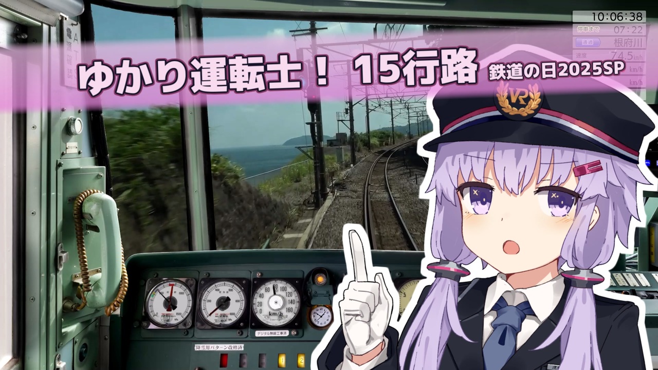 10月14日は<strong><u>「鉄道の日」</u></strong>!<br>「鉄道唱歌」を交えて沿線の名所・史跡に触れながら、列車を運転する「運転士」の仕事にゆかりさんが挑みます。<br>鉄分濃いめのトークと、解説、そしてゆかりさんの鮮やかな<span style="font-size: 10px;">(?)</span>プレイングと共に、ノーカットでお届けするまったりゆったりした旅気分をお楽しみいただけましたら幸いです。晩酌のお供に、チルタイムのお供にゆったりとした擬似鉄道旅はいかがですか?<br><br>こちらは前編(<a href="https://www.nicovideo.jp/watch/sm45483144" class="watch">sm45483144</a>)からの続きとなります。約20秒の遅れで大船駅に到着したゆかりさんは、定刻を目指して回復を試みます――。<br><br><span style="font-size: 16px;"><strong><u>☆チャプター</u></strong></span><br><a href="#" class="seekTime" data-seekTime="00:00" onclick="seekNicoPlayer('#00:00'); return false;">#00:00</a>~ 大船駅到着後<br><a href="#" class="seekTime" data-seekTime="24:07" onclick="seekNicoPlayer('#24:07'); return false;">#24:07</a>~ 小田原駅 到着<br><a href="#" class="seekTime" data-seekTime="36:55" onclick="seekNicoPlayer('#36:55'); return false;">#36:55</a>~ 湯河原駅 到着<br><a href="#" class="seekTime" data-seekTime="43:24" onclick="seekNicoPlayer('#43:24'); return false;">#43:24</a>~ 熱海駅 到着<br><a href="#" class="seekTime" data-seekTime="43:42" onclick="seekNicoPlayer('#43:42'); return false;">#43:42</a>~ エンディング<br><br>――――――――――――――――――――――――――――――――<br><span style="font-size: 16px;"><strong><u>〇遊んだゲーム</u></strong></span><br>JR東日本トレインシミュレータ(Steam):<a href="https://store.steampowered.com/app/2111630/JR_EAST_Train_Simulator/" target="_blank" rel="noopener nofollow">https://store.steampowered.com/app/2111630/JR_EAST_Train_Simulator/</a><br>(※動画と同じ列車を遊ぶには、別途「東海道線DLC」および「185系DLC」が必要です。) <br>――――――――――――――――――――――――――――――――<br><span style="font-size: 16px;"><strong><u>〇今回運転した列車</u></strong></span><br><span style="color: #e69138;">東海道</span><span style="color: #38761d;">線</span> <span style="color: #ff0000;"><strong>特急</strong></span>踊り子3号(3023M) 東京→大船(動画分割)→熱海<br><br><br><a target="_blank" href="https://qa.nicovideo.jp/faq/show/19424?site_domain=default" style="font-size: 13px;color: #657586; text-decoration: underline; line-height: 1.4">この動画は投稿者によって修正されました</a>