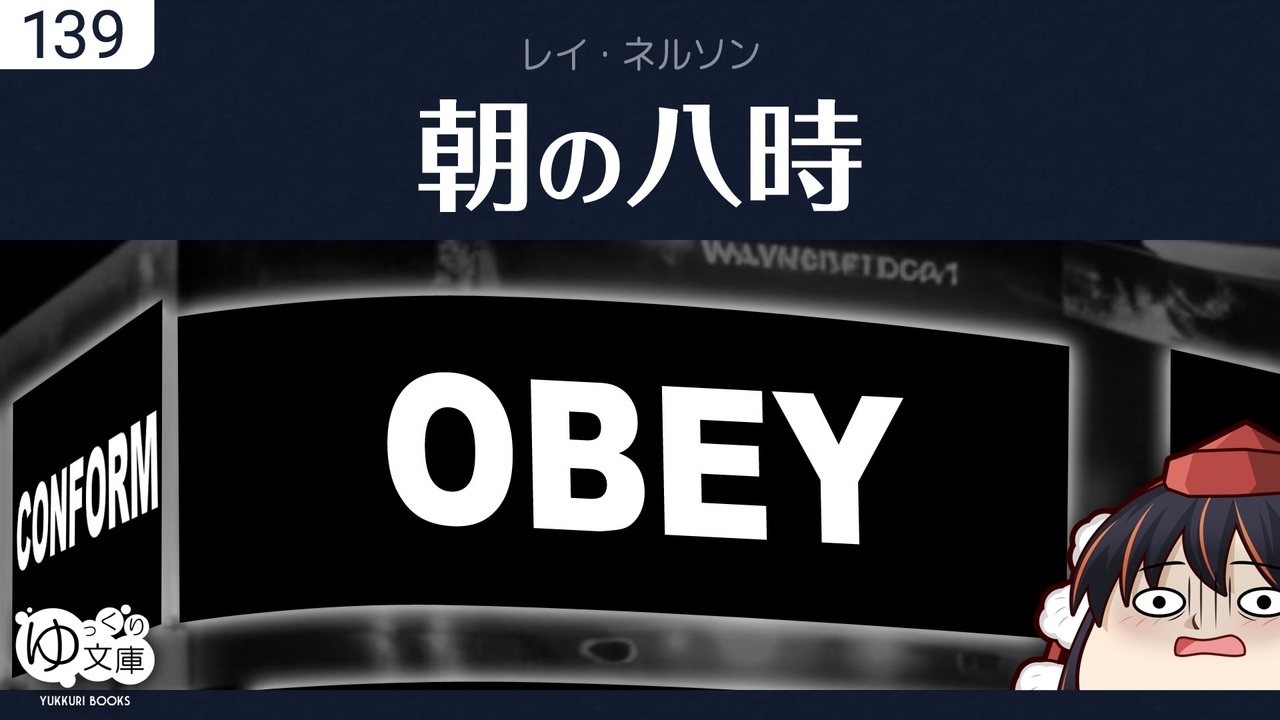 <span style="color: red;"><strong>139 目を覚ませ──</strong></span><br>世界がエイリアンに催眠支配されていたことに気付いたナダは、それをみなに伝えようとする。ジョン・カーペンター監督のSFアクション映画『ゼイリブ』の原作。<br><span style="color: green;">Eight O’Clock in the Morning (1963) by Ray Nelson</span><br>原文:<a href="https://pvto.weebly.com/uploads/9/1/5/0/91508780/eight_o%E2%80%99clock_in_the_morning-nelson.pdf" target="_blank" rel="noopener nofollow">https://pvto.weebly.com/uploads/9/1/5/0/91508780/eight_o%E2%80%99clock_in_the_morning-nelson.pdf</a><br><br>(うp主より)『朝の八時』は6ページ。描写が足りず、ちがう解釈が成り立つ。レイ・ネルソンが意図したものじゃないかもしれないが、文庫版はちがう解釈にアレンジ。翻案箇所は解説パートに記載した。<br>(うp主より)長編に行き詰まり、短編とサクッと投稿するつもりが、解説パートに3週間もかかってしまった。陰謀論やマインドコントロール、アメリカ社会とSF映画の歴史を調べたら、おもしろくなってしまった。解説動画じゃないから大部分はカット。生放送のネタにする。<br>解説スレ:<a href="https://x.com/trynext/status/1975878892931228121" target="_blank" rel="noopener nofollow">https://x.com/trynext/status/1975878892931228121</a><br>ラジオ:<a href="https://www.youtube.com/watch?v=hspmYzU-ar8" target="_blank" rel="noopener nofollow">https://www.youtube.com/watch?v=hspmYzU-ar8</a><br><br>●ゆっくり文庫のSF:<a href="https://www.nicovideo.jp/mylist/77059720" target="_blank" rel="noopener">mylist/77059720</a><br><a href="https://www.nicovideo.jp/watch/sm24009940" class="watch">sm24009940</a> グスコーブドリの伝記<br><a href="https://www.nicovideo.jp/watch/sm35411207" class="watch">sm35411207</a> 紅魔大作戦:謎の球体<br><a href="https://www.nicovideo.jp/watch/sm37071872" class="watch">sm37071872</a> 終わりなき戦い<br><a href="https://www.nicovideo.jp/watch/sm37852402" class="watch">sm37852402</a> 冷たい方程式<br><a href="https://www.nicovideo.jp/watch/sm40394423" class="watch">sm40394423</a> 凍った旅<br><a href="https://www.nicovideo.jp/watch/sm40715087" class="watch">sm40715087</a> 新加速剤<br><a href="https://www.nicovideo.jp/watch/sm41040688" class="watch">sm41040688</a> 回答、辺境防衛<br><a href="https://www.nicovideo.jp/watch/sm41050256" class="watch">sm41050256</a> 闇に囁くもの<br><a href="https://www.nicovideo.jp/watch/sm45490594" class="watch">sm45490594</a> <span style="color: #ff00ff;"><strong>朝の八時</strong></span><br><br><strong>●ゆっくり文庫について</strong><br>全部:<a href="https://www.nicovideo.jp/mylist/74874627" target="_blank" rel="noopener">mylist/74874627</a><br>近況:<a href="https://twitter.com/trynext" target="_blank" rel="noopener nofollow">https://twitter.com/trynext</a><br>---<br>
