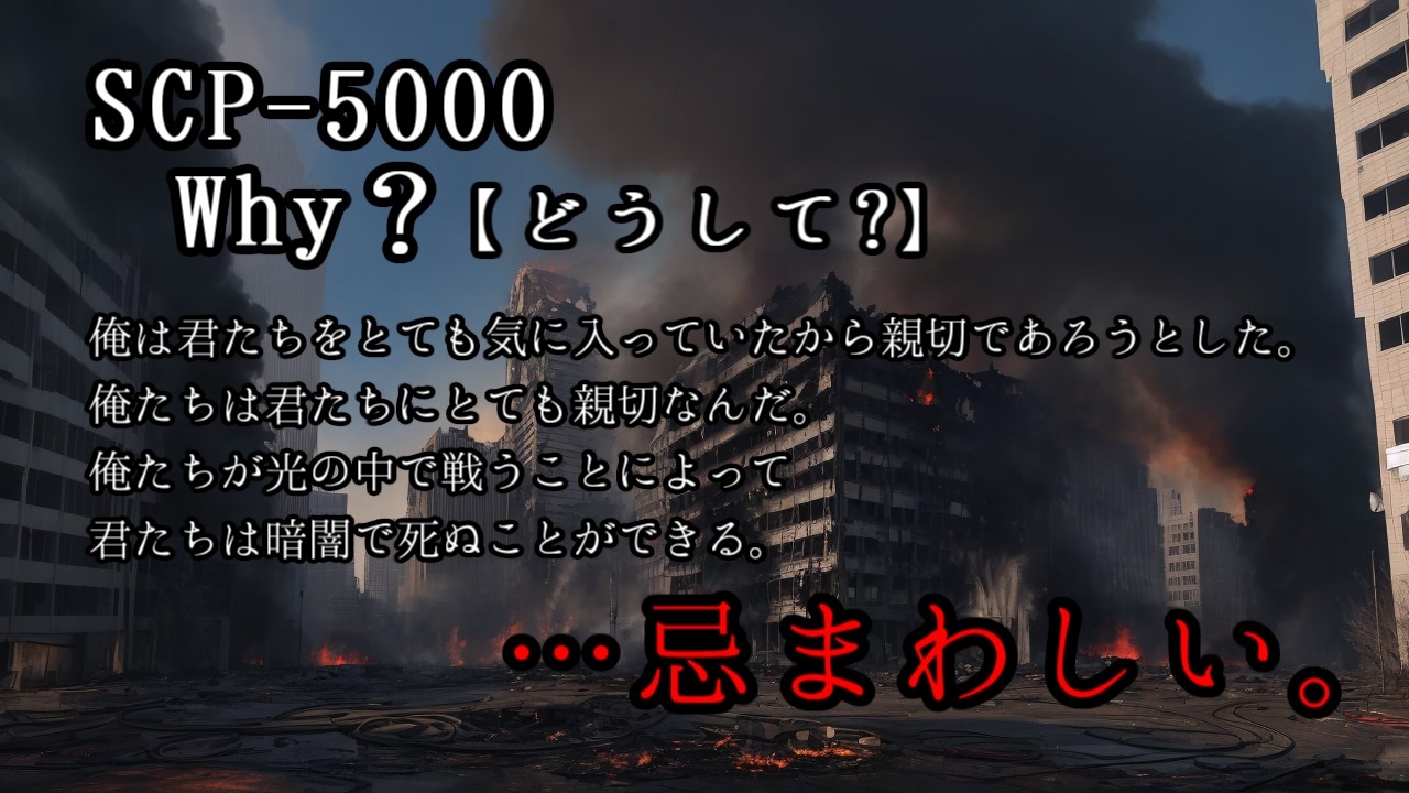 SCPたちがSCPを解説します。<br><br>SCP-5000【Why?(どうして?)】<br>引用元:<a href="http://scp-jp.wikidot.com/scp-5000" target="_blank" rel="noopener nofollow">http://scp-jp.wikidot.com/scp-5000</a><br>作成:Tanhony 様<br><br>前回動画<br>【SCPが紹介する】可愛くて癒される猫ちゃん【SCP】<br><a href="https://www.nicovideo.jp/watch/sm44477116" target="_blank" rel="noopener nofollow">https://www.nicovideo.jp/watch/sm44477116</a><br><br>ツイッターを開設いたしました。<br>よろしければフォローのほど、よろしくお願いいたします。<a href="https://twitter.com/SCPbySCP" target="_blank" rel="noopener nofollow">https://twitter.com/SCPbySCP</a><br><br>主な素材は下記のサイトから拝借しております。<br>・OtoLogic 様<br>URL:<a href="https://otologic.jp/" target="_blank" rel="noopener nofollow">https://otologic.jp/</a><br>・写真AC 様<br>URL:<a href="https://www.photo-ac.com/" target="_blank" rel="noopener nofollow">https://www.photo-ac.com/</a><br>・魔王魂 様<br>URL:<a href="https://maou.audio/" target="_blank" rel="noopener nofollow">https://maou.audio/</a>
