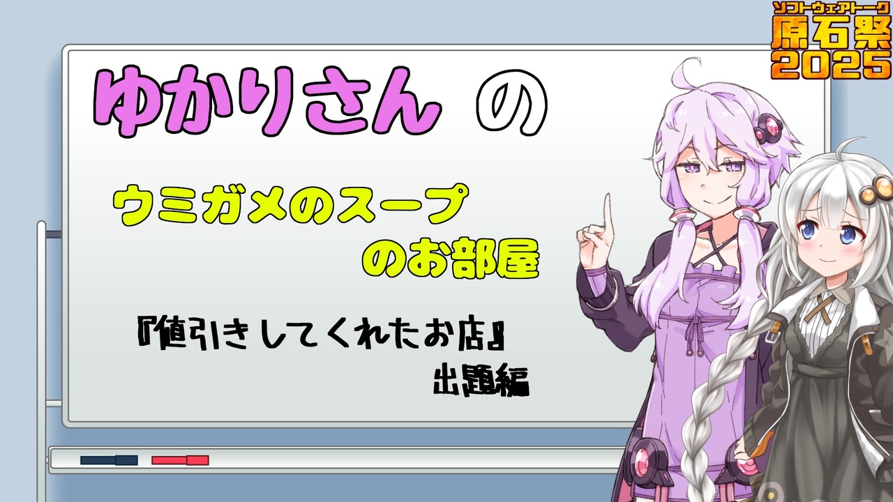 結月ゆかりさんがウミガメのスープの問題をあなたに投げかけます。紲星あかりちゃんとともに真相にたどり着こう。<br><br><br>よかったらこちらもチェックしてね。<br><br>シリーズ <a href="https://www.nicovideo.jp/series/534150" target="_blank" rel="noopener">series/534150</a><br>マイリスト <a href="https://www.nicovideo.jp/mylist/77192547" target="_blank" rel="noopener">mylist/77192547</a><br>X(旧Twitter) <a href="https://twitter.com/Ma3maaakun" target="_blank" rel="noopener nofollow">https://twitter.com/Ma3maaakun</a><br>YouTube <a href="https://www.youtube.com/channel/UCbQA_JBWDIcMM8MtpTM6hyQ" target="_blank" rel="noopener nofollow">https://www.youtube.com/channel/UCbQA_JBWDIcMM8MtpTM6hyQ</a><br><br><br>動画に使わせていただいたもの等<br><br>(ウミガメのスープ問題作成)<br>ま・マ・MA・まーくん<br><br>(キャラクター)<br>結月ゆかりキャラクター 株式会社バンピーファクトリー<br>紲星あかりキャラクター 株式会社バンピーファクトリー<br>結月ゆかり立ち絵イラスト モチノエ 様(ニコニコ静画)<br>紲星あかり立ち絵イラスト ふにちか 様(ニコニコ静画)<br>結月ゆかりの声 VOICEROID2 結月ゆかり<br>紲星あかりの声 VOICEROID2 紲星あかり<br><br>(その他の画像・動画素材)<br>ホワイトボードの背景イラスト フリー素材あそび 様(ニコニ・コモンズ)<br>白いセリフ枠 フリー素材あそび 様(ニコニ・コモンズ)<br>原石祭2025ロゴ 合法少女 アルカ・フェニコ 様(ニコニ・コモンズ)<br>いいね!&フォロー動画 ガッkoya(漫画連載中) 様(ニコニ・コモンズ)<br>高評価&チャンネル登録動画 ガッkoya(漫画連載中) 様(ニコニ・コモンズ)<br><br>(BGM・SE素材)<br>BGM ゲスト! 様(ニコニ・コモンズ)<br><br>(ソフト・ツール)<br>画像編集ソフト GIMP<br>画像編集ツール PSDTool<br>動画編集ソフト ゆっくりMovieMaker4 Lite<br>テキスト読み上げソフト VOICEROID2<br>VOICEROID動画制作支援ツール VoiceroidUtil<br><br>(文字フォント)<br>じゆうちょうフォント<br>にくまるフォント<br>無心<br>コーポレート・ロゴ(ラウンド)ver3<br>MS Pゴシック<br><br><br>もし記載漏れがありましたらご連絡ください。